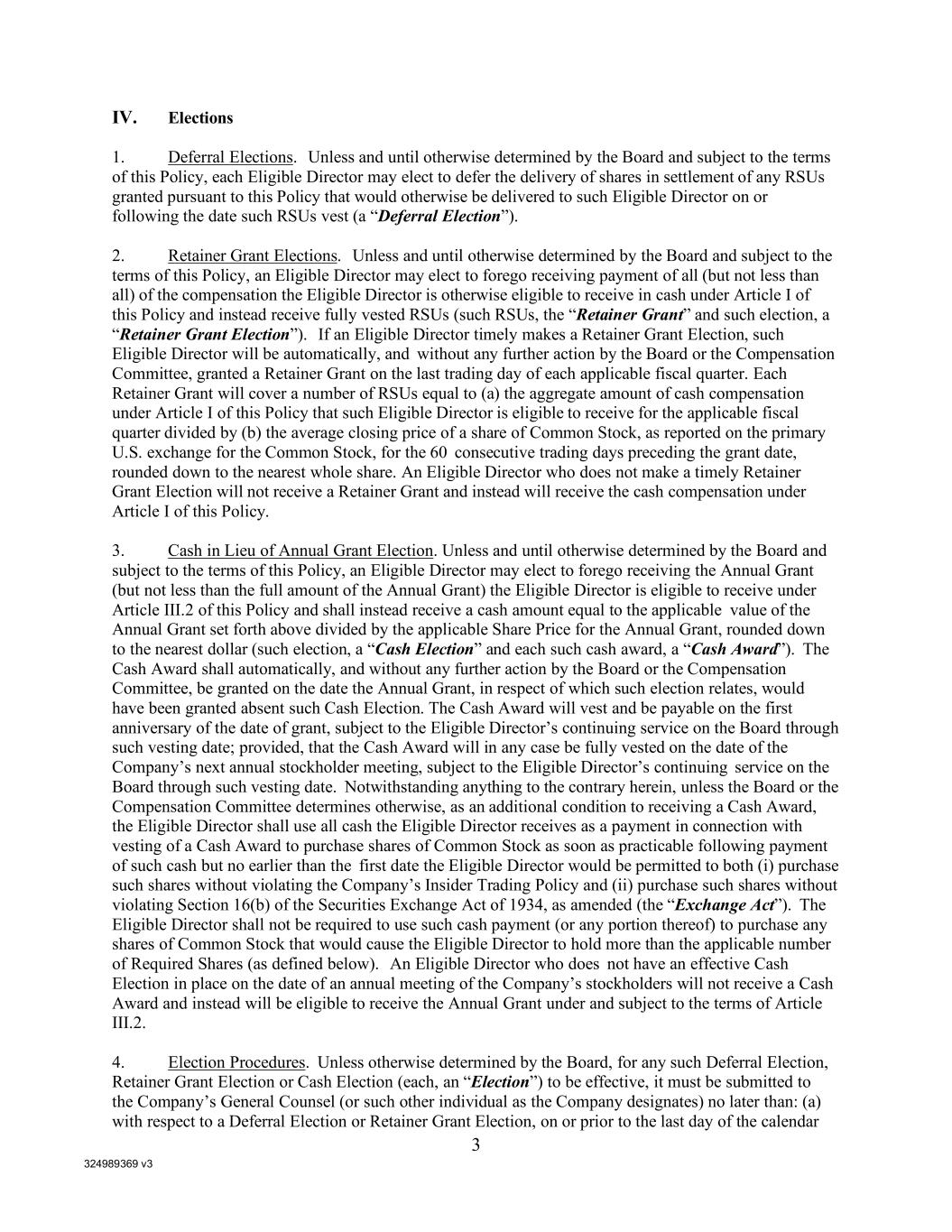 3 324989369 v3 IV. Elections 1. Deferral Elections. Unless and until otherwise determined by the Board and subject to the terms of this Policy, each Eligible Director may elect to defer the delivery of shares in settlement of any RSUs granted pursuant to this Policy that would otherwise be delivered to such Eligible Director on or following the date such RSUs vest (a “Deferral Election”). 2. Retainer Grant Elections. Unless and until otherwise determined by the Board and subject to the terms of this Policy, an Eligible Director may elect to forego receiving payment of all (but not less than all) of the compensation the Eligible Director is otherwise eligible to receive in cash under Article I of this Policy and instead receive fully vested RSUs (such RSUs, the “Retainer Grant” and such election, a “Retainer Grant Election”). If an Eligible Director timely makes a Retainer Grant Election, such Eligible Director will be automatically, and without any further action by the Board or the Compensation Committee, granted a Retainer Grant on the last trading day of each applicable fiscal quarter. Each Retainer Grant will cover a number of RSUs equal to (a) the aggregate amount of cash compensation under Article I of this Policy that such Eligible Director is eligible to receive for the applicable fiscal quarter divided by (b) the average closing price of a share of Common Stock, as reported on the primary U.S. exchange for the Common Stock, for the 60 consecutive trading days preceding the grant date, rounded down to the nearest whole share. An Eligible Director who does not make a timely Retainer Grant Election will not receive a Retainer Grant and instead will receive the cash compensation under Article I of this Policy. 3. Cash in Lieu of Annual Grant Election. Unless and until otherwise determined by the Board and subject to the terms of this Policy, an Eligible Director may elect to forego receiving the Annual Grant (but not less than the full amount of the Annual Grant) the Eligible Director is eligible to receive under Article III.2 of this Policy and shall instead receive a cash amount equal to the applicable value of the Annual Grant set forth above divided by the applicable Share Price for the Annual Grant, rounded down to the nearest dollar (such election, a “Cash Election” and each such cash award, a “Cash Award”). The Cash Award shall automatically, and without any further action by the Board or the Compensation Committee, be granted on the date the Annual Grant, in respect of which such election relates, would have been granted absent such Cash Election. The Cash Award will vest and be payable on the first anniversary of the date of grant, subject to the Eligible Director’s continuing service on the Board through such vesting date; provided, that the Cash Award will in any case be fully vested on the date of the Company’s next annual stockholder meeting, subject to the Eligible Director’s continuing service on the Board through such vesting date. Notwithstanding anything to the contrary herein, unless the Board or the Compensation Committee determines otherwise, as an additional condition to receiving a Cash Award, the Eligible Director shall use all cash the Eligible Director receives as a payment in connection with vesting of a Cash Award to purchase shares of Common Stock as soon as practicable following payment of such cash but no earlier than the first date the Eligible Director would be permitted to both (i) purchase such shares without violating the Company’s Insider Trading Policy and (ii) purchase such shares without violating Section 16(b) of the Securities Exchange Act of 1934, as amended (the “Exchange Act”). The Eligible Director shall not be required to use such cash payment (or any portion thereof) to purchase any shares of Common Stock that would cause the Eligible Director to hold more than the applicable number of Required Shares (as defined below). An Eligible Director who does not have an effective Cash Election in place on the date of an annual meeting of the Company’s stockholders will not receive a Cash Award and instead will be eligible to receive the Annual Grant under and subject to the terms of Article III.2. 4. Election Procedures. Unless otherwise determined by the Board, for any such Deferral Election, Retainer Grant Election or Cash Election (each, an “Election”) to be effective, it must be submitted to the Company’s General Counsel (or such other individual as the Company designates) no later than: (a) with respect to a Deferral Election or Retainer Grant Election, on or prior to the last day of the calendar