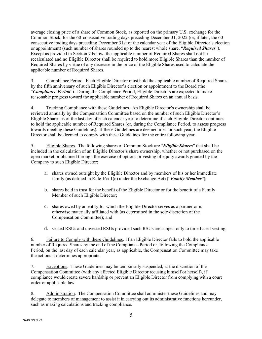 5 324989369 v3 average closing price of a share of Common Stock, as reported on the primary U.S. exchange for the Common Stock, for the 60 consecutive trading days preceding December 31, 2022 (or, if later, the 60 consecutive trading days preceding December 31st of the calendar year of the Eligible Director’s election or appointment) (such number of shares rounded up to the nearest whole share, “Required Shares”). Except as provided in Section 7 below, the applicable number of Required Shares shall not be recalculated and no Eligible Director shall be required to hold more Eligible Shares than the number of Required Shares by virtue of any decrease in the price of the Eligible Shares used to calculate the applicable number of Required Shares. 3. Compliance Period. Each Eligible Director must hold the applicable number of Required Shares by the fifth anniversary of such Eligible Director’s election or appointment to the Board (the “Compliance Period”). During the Compliance Period, Eligible Directors are expected to make reasonable progress toward the applicable number of Required Shares on an annual basis. 4. Tracking Compliance with these Guidelines. An Eligible Director’s ownership shall be reviewed annually by the Compensation Committee based on the number of such Eligible Director’s Eligible Shares as of the last day of each calendar year to determine if such Eligible Director continues to hold the applicable number of Required Shares (or, during the Compliance Period, to assess progress towards meeting these Guidelines). If these Guidelines are deemed met for such year, the Eligible Director shall be deemed to comply with these Guidelines for the entire following year. 5. Eligible Shares. The following shares of Common Stock are “Eligible Shares” that shall be included in the calculation of an Eligible Director’s share ownership, whether or not purchased on the open market or obtained through the exercise of options or vesting of equity awards granted by the Company to such Eligible Director: a. shares owned outright by the Eligible Director and by members of his or her immediate family (as defined in Rule 16a-1(e) under the Exchange Act) (“Family Member”); b. shares held in trust for the benefit of the Eligible Director or for the benefit of a Family Member of such Eligible Director; c. shares owed by an entity for which the Eligible Director serves as a partner or is otherwise materially affiliated with (as determined in the sole discretion of the Compensation Committee); and d. vested RSUs and unvested RSUs provided such RSUs are subject only to time-based vesting. 6. Failure to Comply with these Guidelines. If an Eligible Director fails to hold the applicable number of Required Shares by the end of the Compliance Period or, following the Compliance Period, on the last day of each calendar year, as applicable, the Compensation Committee may take the actions it determines appropriate. 7. Exceptions. These Guidelines may be temporarily suspended, at the discretion of the Compensation Committee (with any affected Eligible Director recusing himself or herself), if compliance would create severe hardship or prevent an Eligible Director from complying with a court order or applicable law. 8. Administration. The Compensation Committee shall administer these Guidelines and may delegate to members of management to assist it in carrying out its administrative functions hereunder, such as making calculations and tracking compliance.