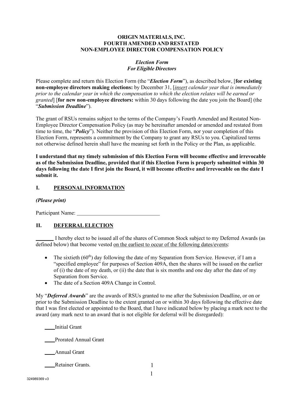 1 1 324989369 v3 ORIGIN MATERIALS, INC. FOURTH AMENDED AND RESTATED NON-EMPLOYEE DIRECTOR COMPENSATION POLICY Election Form For Eligible Directors Please complete and return this Election Form (the “Election Form”), as described below, [for existing non-employee directors making elections: by December 31, [insert calendar year that is immediately prior to the calendar year in which the compensation to which the election relates will be earned or granted] [for new non-employee directors: within 30 days following the date you join the Board] (the “Submission Deadline”). The grant of RSUs remains subject to the terms of the Company’s Fourth Amended and Restated Non- Employee Director Compensation Policy (as may be hereinafter amended or amended and restated from time to time, the “Policy”). Neither the provision of this Election Form, nor your completion of this Election Form, represents a commitment by the Company to grant any RSUs to you. Capitalized terms not otherwise defined herein shall have the meaning set forth in the Policy or the Plan, as applicable. I understand that my timely submission of this Election Form will become effective and irrevocable as of the Submission Deadline, provided that if this Election Form is properly submitted within 30 days following the date I first join the Board, it will become effective and irrevocable on the date I submit it. I. PERSONAL INFORMATION (Please print) Participant Name: II. DEFERRAL ELECTION I hereby elect to be issued all of the shares of Common Stock subject to my Deferred Awards (as defined below) that become vested on the earliest to occur of the following dates/events: • The sixtieth (60th) day following the date of my Separation from Service. However, if I am a “specified employee” for purposes of Section 409A, then the shares will be issued on the earlier of (i) the date of my death, or (ii) the date that is six months and one day after the date of my Separation from Service. • The date of a Section 409A Change in Control. My “Deferred Awards” are the awards of RSUs granted to me after the Submission Deadline, or on or prior to the Submission Deadline to the extent granted on or within 30 days following the effective date that I was first elected or appointed to the Board, that I have indicated below by placing a mark next to the award (any mark next to an award that is not eligible for deferral will be disregarded): Initial Grant Prorated Annual Grant Annual Grant Retainer Grants.