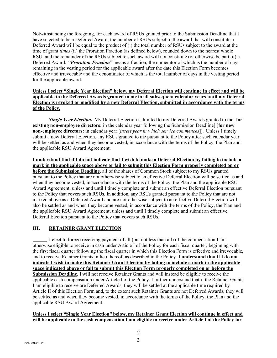2 2 324989369 v3 Notwithstanding the foregoing, for each award of RSUs granted prior to the Submission Deadline that I have selected to be a Deferred Award, the number of RSUs subject to the award that will constitute a Deferred Award will be equal to the product of (i) the total number of RSUs subject to the award at the time of grant times (ii) the Proration Fraction (as defined below), rounded down to the nearest whole RSU, and the remainder of the RSUs subject to such award will not constitute (or otherwise be part of) a Deferred Award. “Proration Fraction” means a fraction, the numerator of which is the number of days remaining in the vesting period for the applicable award after the date this Election Form becomes effective and irrevocable and the denominator of which is the total number of days in the vesting period for the applicable award. Unless I select “Single Year Election” below, my Deferral Election will continue in effect and will be applicable to the Deferred Awards granted to me in all subsequent calendar years until my Deferral Election is revoked or modified by a new Deferral Election, submitted in accordance with the terms of the Policy. Single Year Election. My Deferral Election is limited to my Deferred Awards granted to me [for existing non-employee directors: in the calendar year following the Submission Deadline] [for new non-employee directors: in calendar year [insert year in which service commences]]. Unless I timely submit a new Deferral Election, any RSUs granted to me pursuant to the Policy after such calendar year will be settled as and when they become vested, in accordance with the terms of the Policy, the Plan and the applicable RSU Award Agreement. I understand that if I do not indicate that I wish to make a Deferral Election by failing to include a mark in the applicable space above or fail to submit this Election Form properly completed on or before the Submission Deadline, all of the shares of Common Stock subject to my RSUs granted pursuant to the Policy that are not otherwise subject to an effective Deferral Election will be settled as and when they become vested, in accordance with the terms of the Policy, the Plan and the applicable RSU Award Agreement, unless and until I timely complete and submit an effective Deferral Election pursuant to the Policy that covers such RSUs. In addition, any RSUs granted pursuant to the Policy that are not marked above as a Deferred Award and are not otherwise subject to an effective Deferral Election will also be settled as and when they become vested, in accordance with the terms of the Policy, the Plan and the applicable RSU Award Agreement, unless and until I timely complete and submit an effective Deferral Election pursuant to the Policy that covers such RSUs. III. RETAINER GRANT ELECTION I elect to forego receiving payment of all (but not less than all) of the compensation I am otherwise eligible to receive in cash under Article I of the Policy for each fiscal quarter, beginning with the first fiscal quarter following the fiscal quarter in which this Election Form is effective and irrevocable, and to receive Retainer Grants in lieu thereof, as described in the Policy. I understand that if I do not indicate I wish to make this Retainer Grant Election by failing to include a mark in the applicable space indicated above or fail to submit this Election Form properly completed on or before the Submission Deadline, I will not receive Retainer Grants and will instead be eligible to receive the applicable cash compensation under Article I of the Policy. I further understand that if the Retainer Grants I am eligible to receive are Deferred Awards, they will be settled at the applicable time required by Article II of this Election Form and, to the extent such Retainer Grants are not Deferred Awards, they will be settled as and when they become vested, in accordance with the terms of the Policy, the Plan and the applicable RSU Award Agreement. Unless I select “Single Year Election” below, my Retainer Grant Election will continue in effect and will be applicable to the cash compensation I am eligible to receive under Article I of the Policy for