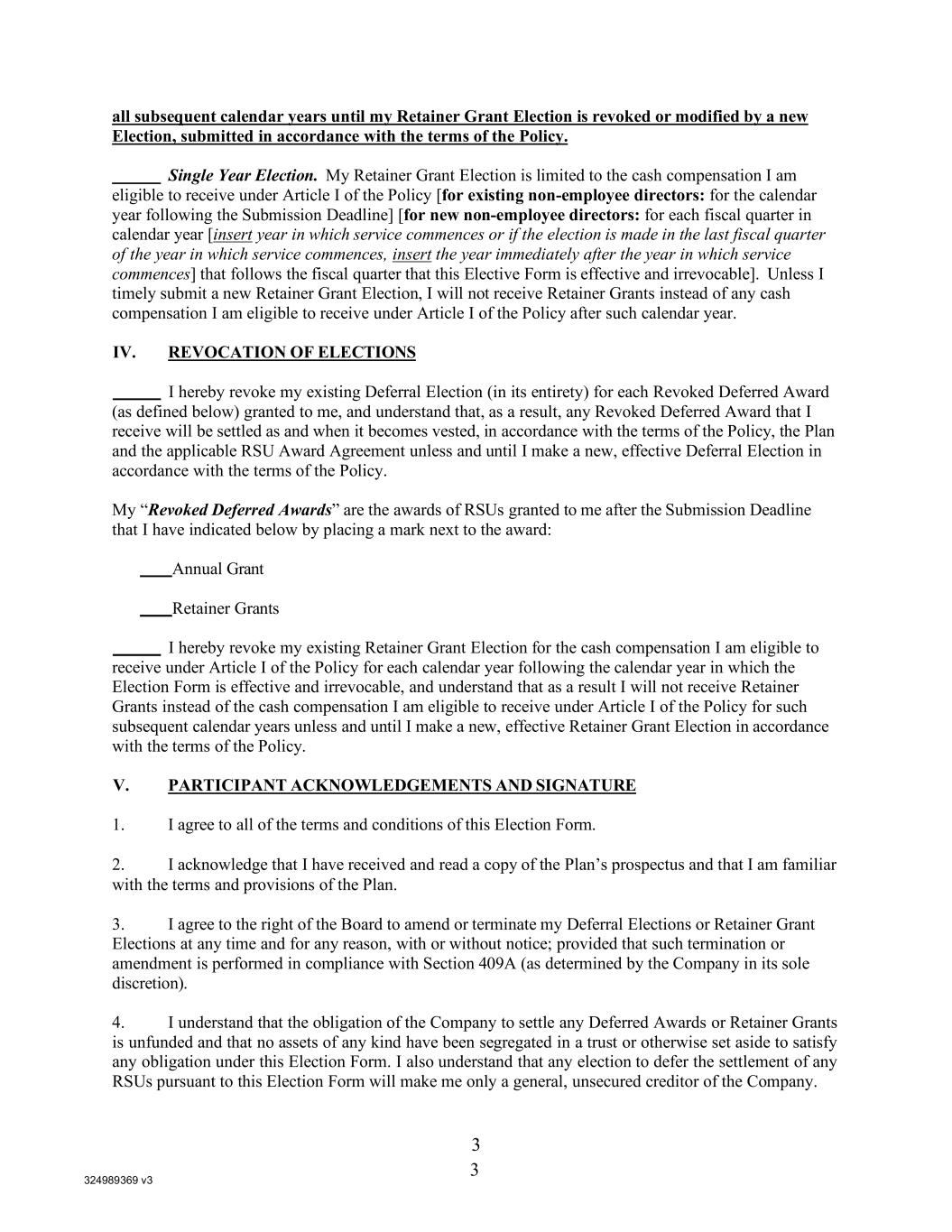 3 3 324989369 v3 all subsequent calendar years until my Retainer Grant Election is revoked or modified by a new Election, submitted in accordance with the terms of the Policy. Single Year Election. My Retainer Grant Election is limited to the cash compensation I am eligible to receive under Article I of the Policy [for existing non-employee directors: for the calendar year following the Submission Deadline] [for new non-employee directors: for each fiscal quarter in calendar year [insert year in which service commences or if the election is made in the last fiscal quarter of the year in which service commences, insert the year immediately after the year in which service commences] that follows the fiscal quarter that this Elective Form is effective and irrevocable]. Unless I timely submit a new Retainer Grant Election, I will not receive Retainer Grants instead of any cash compensation I am eligible to receive under Article I of the Policy after such calendar year. IV. REVOCATION OF ELECTIONS I hereby revoke my existing Deferral Election (in its entirety) for each Revoked Deferred Award (as defined below) granted to me, and understand that, as a result, any Revoked Deferred Award that I receive will be settled as and when it becomes vested, in accordance with the terms of the Policy, the Plan and the applicable RSU Award Agreement unless and until I make a new, effective Deferral Election in accordance with the terms of the Policy. My “Revoked Deferred Awards” are the awards of RSUs granted to me after the Submission Deadline that I have indicated below by placing a mark next to the award: Annual Grant Retainer Grants I hereby revoke my existing Retainer Grant Election for the cash compensation I am eligible to receive under Article I of the Policy for each calendar year following the calendar year in which the Election Form is effective and irrevocable, and understand that as a result I will not receive Retainer Grants instead of the cash compensation I am eligible to receive under Article I of the Policy for such subsequent calendar years unless and until I make a new, effective Retainer Grant Election in accordance with the terms of the Policy. V. PARTICIPANT ACKNOWLEDGEMENTS AND SIGNATURE 1. I agree to all of the terms and conditions of this Election Form. 2. I acknowledge that I have received and read a copy of the Plan’s prospectus and that I am familiar with the terms and provisions of the Plan. 3. I agree to the right of the Board to amend or terminate my Deferral Elections or Retainer Grant Elections at any time and for any reason, with or without notice; provided that such termination or amendment is performed in compliance with Section 409A (as determined by the Company in its sole discretion). 4. I understand that the obligation of the Company to settle any Deferred Awards or Retainer Grants is unfunded and that no assets of any kind have been segregated in a trust or otherwise set aside to satisfy any obligation under this Election Form. I also understand that any election to defer the settlement of any RSUs pursuant to this Election Form will make me only a general, unsecured creditor of the Company.