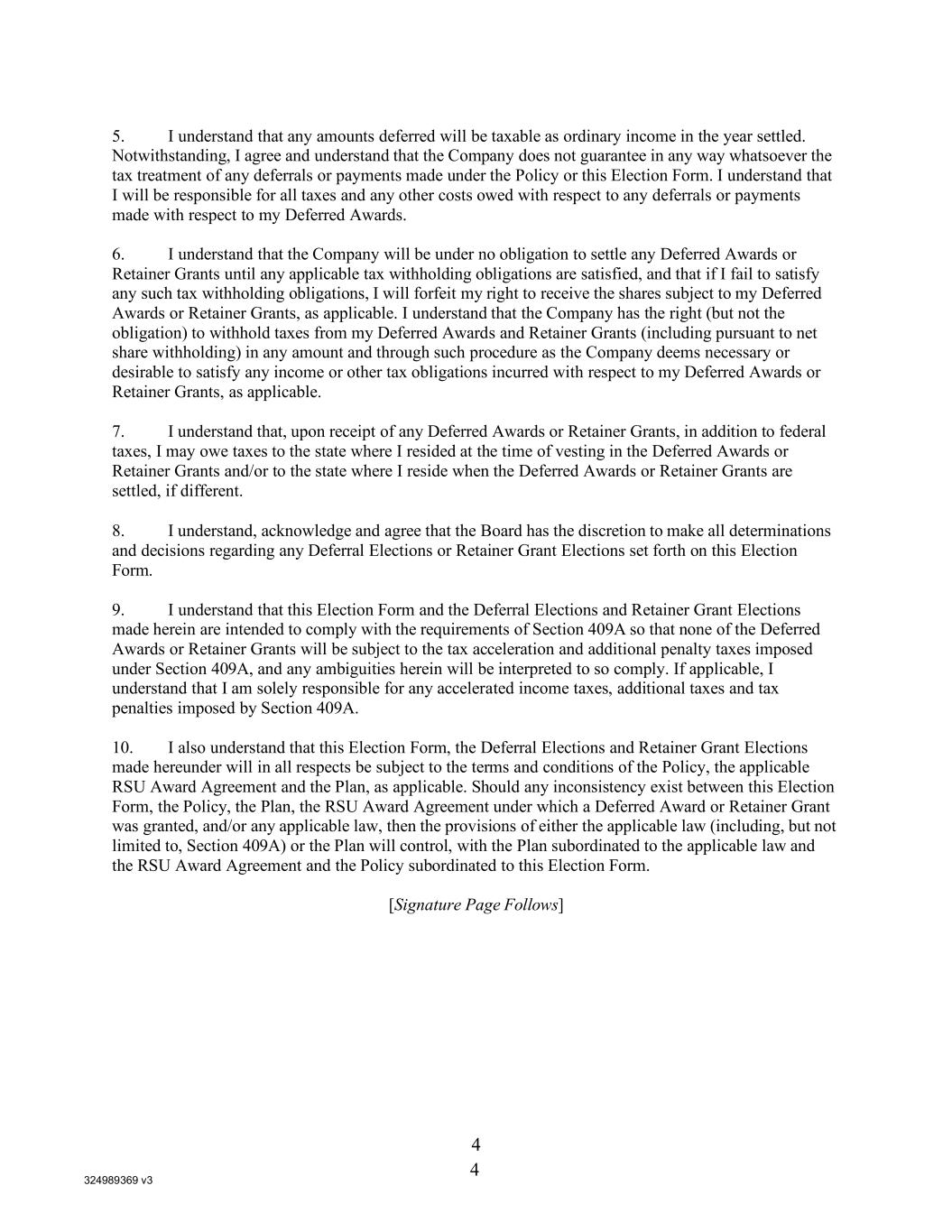 4 4 324989369 v3 5. I understand that any amounts deferred will be taxable as ordinary income in the year settled. Notwithstanding, I agree and understand that the Company does not guarantee in any way whatsoever the tax treatment of any deferrals or payments made under the Policy or this Election Form. I understand that I will be responsible for all taxes and any other costs owed with respect to any deferrals or payments made with respect to my Deferred Awards. 6. I understand that the Company will be under no obligation to settle any Deferred Awards or Retainer Grants until any applicable tax withholding obligations are satisfied, and that if I fail to satisfy any such tax withholding obligations, I will forfeit my right to receive the shares subject to my Deferred Awards or Retainer Grants, as applicable. I understand that the Company has the right (but not the obligation) to withhold taxes from my Deferred Awards and Retainer Grants (including pursuant to net share withholding) in any amount and through such procedure as the Company deems necessary or desirable to satisfy any income or other tax obligations incurred with respect to my Deferred Awards or Retainer Grants, as applicable. 7. I understand that, upon receipt of any Deferred Awards or Retainer Grants, in addition to federal taxes, I may owe taxes to the state where I resided at the time of vesting in the Deferred Awards or Retainer Grants and/or to the state where I reside when the Deferred Awards or Retainer Grants are settled, if different. 8. I understand, acknowledge and agree that the Board has the discretion to make all determinations and decisions regarding any Deferral Elections or Retainer Grant Elections set forth on this Election Form. 9. I understand that this Election Form and the Deferral Elections and Retainer Grant Elections made herein are intended to comply with the requirements of Section 409A so that none of the Deferred Awards or Retainer Grants will be subject to the tax acceleration and additional penalty taxes imposed under Section 409A, and any ambiguities herein will be interpreted to so comply. If applicable, I understand that I am solely responsible for any accelerated income taxes, additional taxes and tax penalties imposed by Section 409A. 10. I also understand that this Election Form, the Deferral Elections and Retainer Grant Elections made hereunder will in all respects be subject to the terms and conditions of the Policy, the applicable RSU Award Agreement and the Plan, as applicable. Should any inconsistency exist between this Election Form, the Policy, the Plan, the RSU Award Agreement under which a Deferred Award or Retainer Grant was granted, and/or any applicable law, then the provisions of either the applicable law (including, but not limited to, Section 409A) or the Plan will control, with the Plan subordinated to the applicable law and the RSU Award Agreement and the Policy subordinated to this Election Form. [Signature Page Follows]