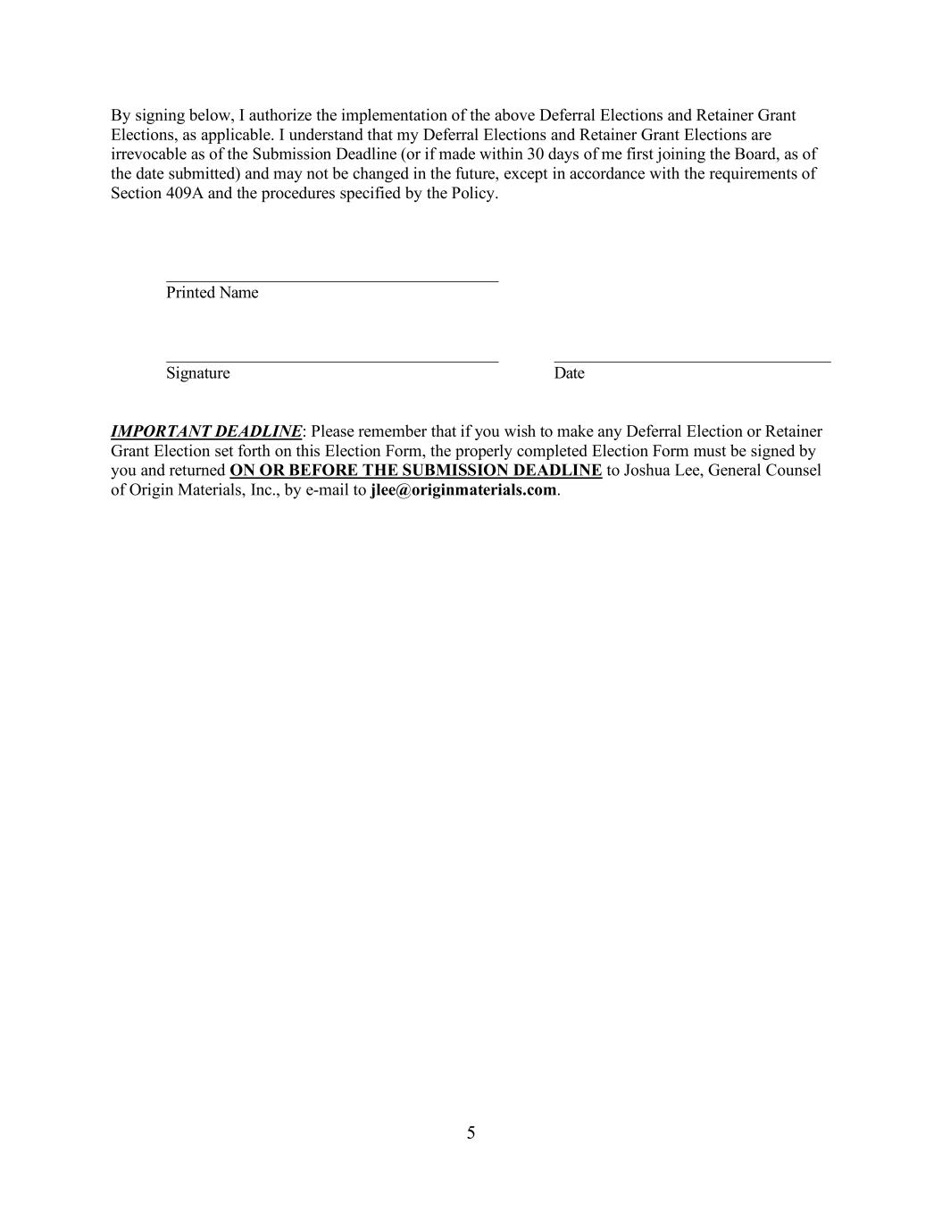 5 By signing below, I authorize the implementation of the above Deferral Elections and Retainer Grant Elections, as applicable. I understand that my Deferral Elections and Retainer Grant Elections are irrevocable as of the Submission Deadline (or if made within 30 days of me first joining the Board, as of the date submitted) and may not be changed in the future, except in accordance with the requirements of Section 409A and the procedures specified by the Policy. Printed Name Signature Date IMPORTANT DEADLINE: Please remember that if you wish to make any Deferral Election or Retainer Grant Election set forth on this Election Form, the properly completed Election Form must be signed by you and returned ON OR BEFORE THE SUBMISSION DEADLINE to Joshua Lee, General Counsel of Origin Materials, Inc., by e-mail to jlee@originmaterials.com.