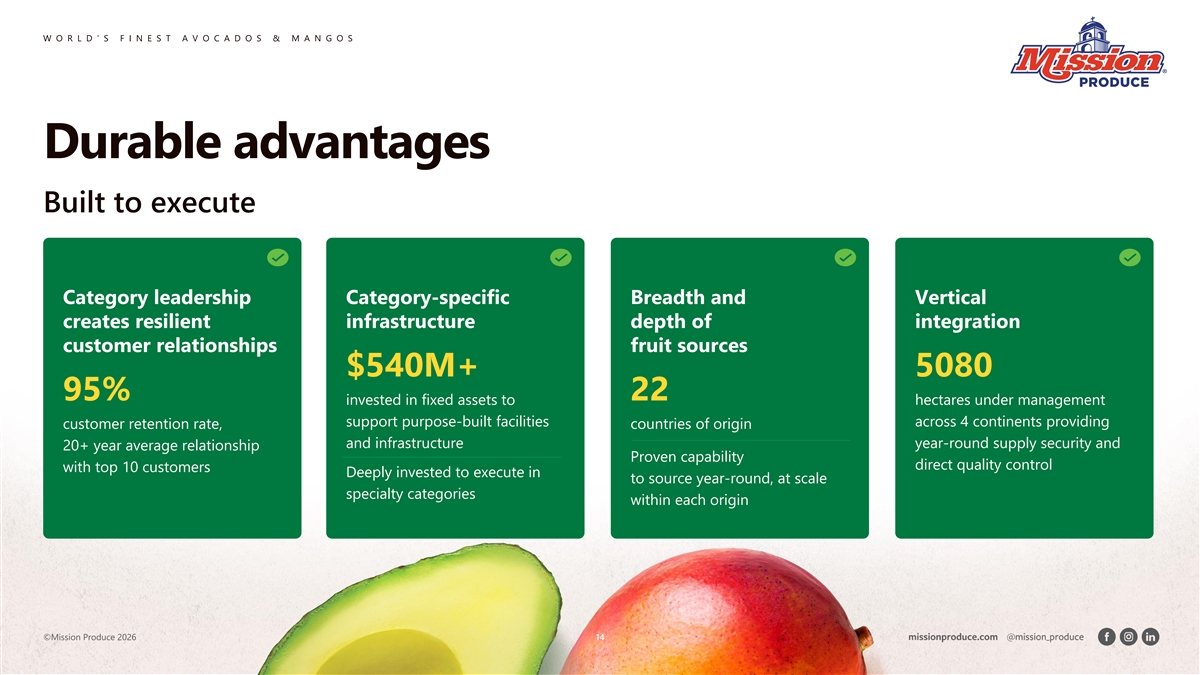 W O R L D ’ S F I N E S T A V O C A D O S & M A N G O S Attractive market supported by on-trend category dynamics Large and growing Durable secular tailwinds Provides runway for increased 7 addressable markets driven by powerful trends per-capita consumption globally Global avocado market Health & Wellness U.S.: 8 lbs/year per capita 1,2 3 ~$20B growing to 57% of consumers prioritize healthy eating vs. Mexico at 20 lbs/year 2 4 $27B by 2030 (6.3% CAGR) GLP-1s: penetration is on the rise at 8%+ Europe: 2 lbs/year – implies 4x growth potential shifting focus to store perimeter, avocado a super food (to meet US penetration) Hispanic Demographics Global mango market Asia: <1 lb/year with ~10x growth potential Growing 2% annually, 2 ~$55B growing to 5 (to meet US penetration) spending 73% more per household 2 $68B by 2030 (4.4% CAGR) Millennial/Gen Z 6 71% purchase rate vs. 45% older generations (1) Rabobank Group, RaboResearch Global Avocado Update 2025. (2) Mordor Intelligence (3) Numerator Advanced Shopper Profile Report, 12 months ending 9/30/2025. (4) Cornell University GLP-1 Study. (5) Pew Research Center. 2025. (6) Numerator Shopper Metrics Report, 12 months ending 9/30/2025. (7) FruiTrop Magazine. September-October 2024 ©Mission Produce 2026 13
