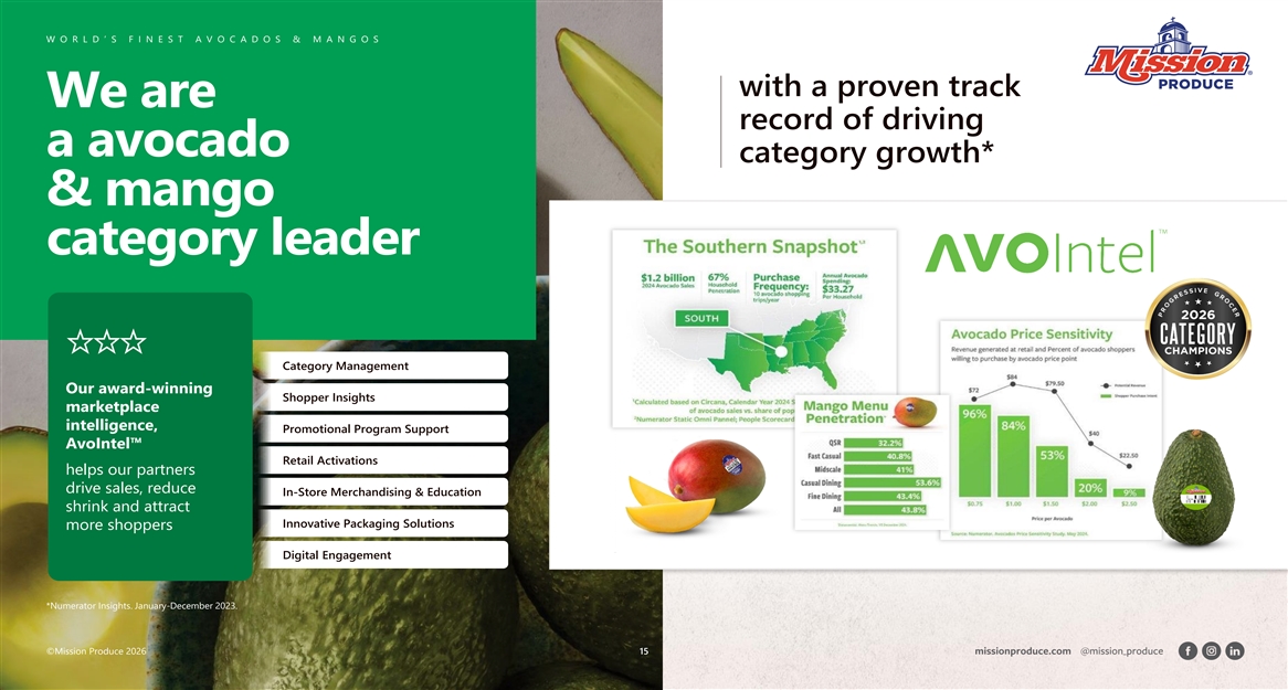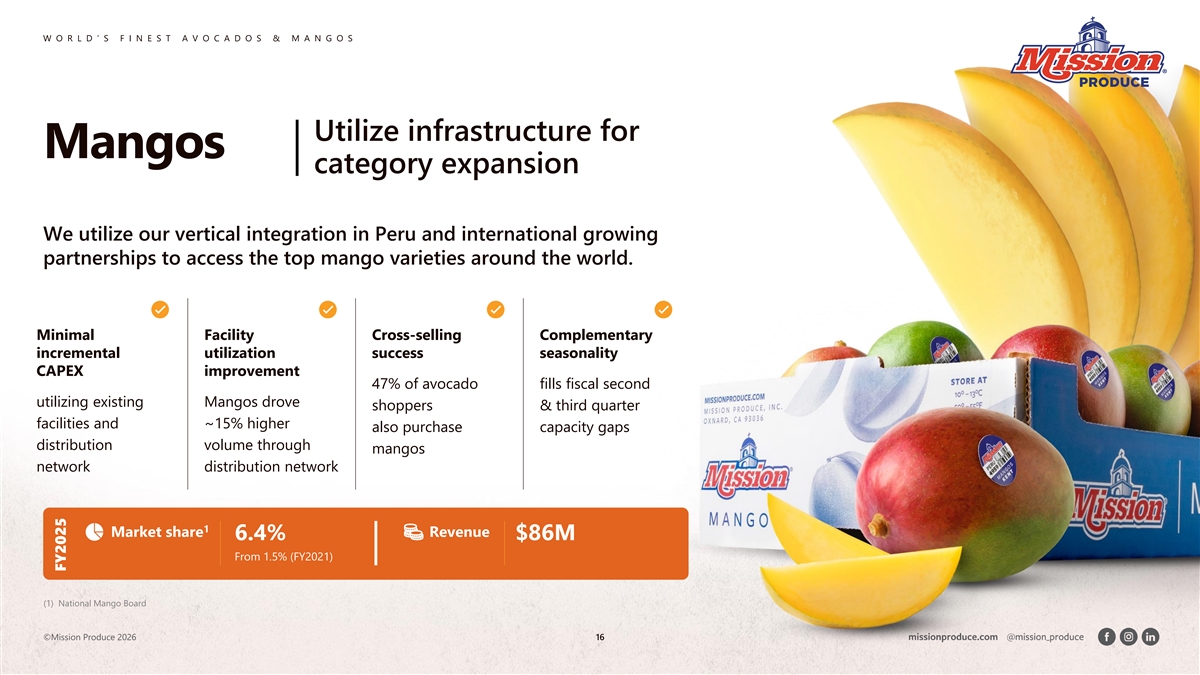 W W O O R R L L D D ’’ S S F F II N N E E S S T T A A V V O O C C A A D D O O S S & & M M A A N N G G O O S S with a proven track We are record of driving a avocado category growth* & mango category leader Category Management Our award-winning Shopper Insights marketplace intelligence, Promotional Program Support AvoIntel™ Retail Activations helps our partners drive sales, reduce In-Store Merchandising & Education shrink and attract Innovative Packaging Solutions more shoppers Digital Engagement *Numerator Insights. January-December 2023. ©Mi ©Mis ss sion Pr ion Pro oduce duce 2026 2026 15