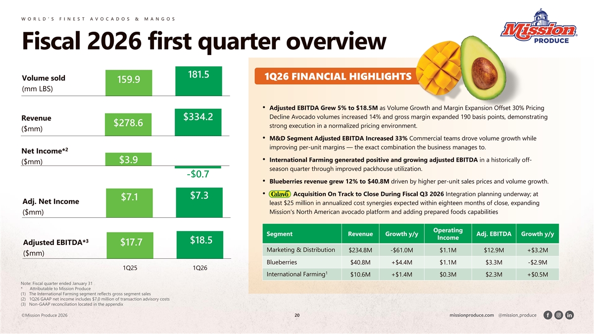 W O R L D ’ S F I N E S T A V O C A D O S & M A N G O S Fiscal 2026 first quarter overview 181.5 1Q26 FINANCIAL HIGHLIGHTS Volume sold 159.9 (mm LBS) • Adjusted EBITDA Grew 5% to $18.5M as Volume Growth and Margin Expansion Offset 30% Pricing Decline Avocado volumes increased 14% and gross margin expanded 190 basis points, demonstrating $334.2 Revenue $278.6 strong execution in a normalized pricing environment. ($mm) • M&D Segment Adjusted EBITDA Increased 33% Commercial teams drove volume growth while improving per-unit margins — the exact combination the business manages to. 2 Net Income* • International Farming generated positive and growing adjusted EBITDA in a historically off- $3.9 ($mm) season quarter through improved packhouse utilization. -$0.7 • Blueberries revenue grew 12% to $40.8M driven by higher per-unit sales prices and volume growth. • Acquisition On Track to Close During Fiscal Q3 2026 Integration planning underway; at $7.3 $7.1 Adj. Net Income least $25 million in annualized cost synergies expected within eighteen months of close, expanding Mission's North American avocado platform and adding prepared foods capabilities ($mm) Operating Segment Revenue Growth y/y Adj. EBITDA Growth y/y Income 3 $18.5 Adjusted EBITDA* $17.7 Marketing & Distribution $234.8M -$61.0M $1.1M $12.9M +$3.2M ($mm) Blueberries $40.8M +$4.4M $1.1M $3.3M -$2.9M 1Q25 1Q26 1 International Farming $10.6M +$1.4M $0.3M $2.3M +$0.5M Note: Fiscal quarter ended January 31 * Attributable to Mission Produce (1) The International Farming segment reflects gross segment sales (2) 1Q26 GAAP net income includes $7.0 million of transaction advisory costs (3) Non-GAAP reconciliation located in the appendix ©Mission Produce 2026 20