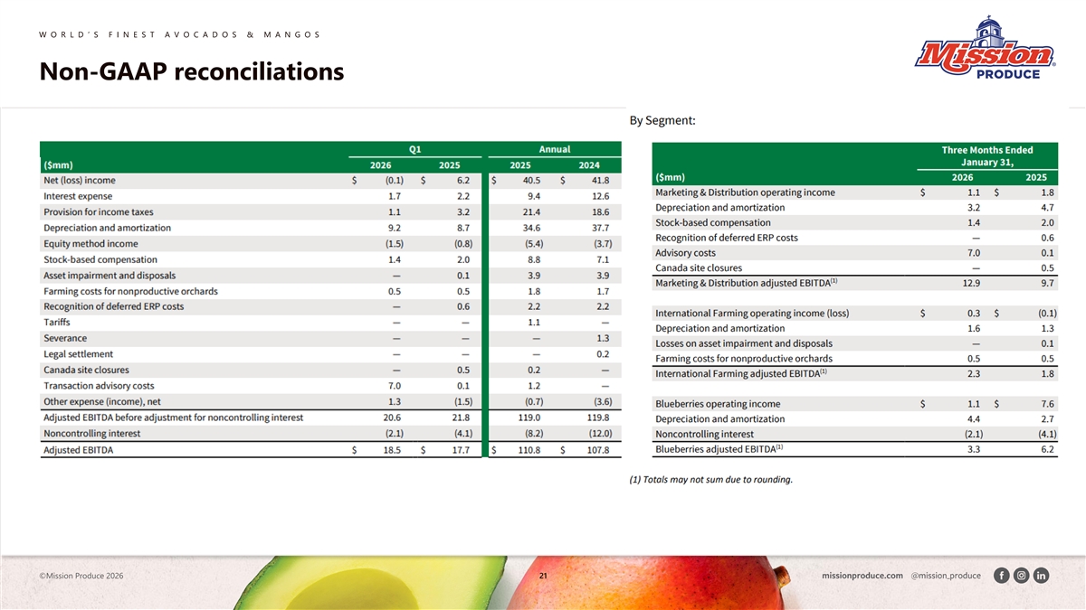 W O R L D ’ S F I N E S T A V O C A D O S & M A N G O S Non-GAAP reconciliations ©Mission Produce 2026 21