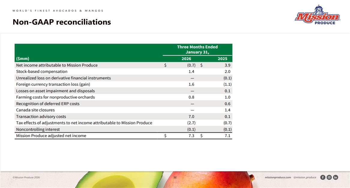 W O R L D ’ S F I N E S T A V O C A D O S & M A N G O S Non-GAAP reconciliations ©Mission Produce 2026 22