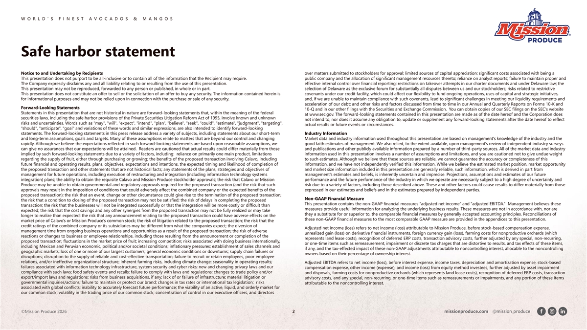 W O R L D ’ S F I N E S T A V O C A D O S & M A N G O S Additional Disclosures NO OFFER OR SOLICITATION This communication is not intended to be, and shall not constitute, an offer to buy or sell or the solicitation of an offer to buy or sell any securities, or a solicitation of any vote or approval, nor shall there be any sale of securities in any jurisdiction in which such offer, solicitation or sale would be unlawful prior to registration or qualification under the securities laws of any such jurisdiction. No offering of securities shall be made, except by means of a prospectus meeting the requirements of Section 10 of the Securities Act of 1933, as amended. IMPORTANT ADDITIONAL INFORMATION WILL BE FILED WITH THE SEC In connection with the proposed transaction, Calavo and Mission have filed a joint proxy statement with the SEC and Mission has filed with the SEC a registration statement on Form S-4 that includes the joint proxy statement of Calavo and Mission and that also constitutes a prospectus of Mission (the “Joint Proxy Statement/Prospectus”). Each of Calavo and Mission may also file other relevant documents with the SEC regarding the proposed transaction. This document is not a substitute for the Joint Proxy Statement/Prospectus or registration statement or any other document that Calavo or Mission may file with the SEC. The definitive Joint Proxy Statement/Prospectus will be mailed to stockholders of Calavo and Mission. INVESTORS AND SECURITY HOLDERS ARE URGED TO READ THE REGISTRATION STATEMENT, JOINT PROXY STATEMENT/PROSPECTUS AND ANY OTHER RELEVANT DOCUMENTS THAT MAY BE FILED WITH THE SEC, AS WELL AS ANY AMENDMENTS OR SUPPLEMENTS TO THOSE DOCUMENTS CAREFULLY AND IN THEIR ENTIRETY IF AND WHEN THEY BECOME AVAILABLE BECAUSE THEY CONTAIN OR WILL CONTAIN IMPORTANT INFORMATION ABOUT CALAVO, MISSION AND THE PROPOSED TRANSACTION. Investors and security holders will be able to obtain free copies of the registration statement and Joint Proxy Statement/Prospectus (if and when available) and other documents containing important information about Calavo, Mission and the proposed transaction, once such documents are filed with the SEC through the website maintained by the SEC at http://www.sec.gov. Copies of the Form S-4 and Joint Proxy Statement/Prospectus (if and when available) and other documents filed with the SEC by Calavo may be obtained free of charge on Calavo’s website at Calavo’s SEC Filings Website or, alternatively, by directing a request by mail to Calavo’s Corporate Secretary at Calavo Attention: Corporate Secretary, Calavo Growers, Inc., 1141A Cummings Road, Santa Paula, CA 93060. Copies of the registration statement and Joint Proxy Statement/Prospectus and other documents filed with the SEC by Mission may be obtained free of charge on Mission’s website at Mission’s SEC Filings Website or, alternatively, by directing a request by mail to Mission’s Corporate Secretary at Mission Attention: Corporate Secretary, Mission Produce, Inc., 2710 Camino Del Sol, Oxnard, CA 93030. PARTICIPANTS IN THE SOLICITATION Calavo, Mission and certain of their respective directors and executive officers may be deemed to be participants in the solicitation of proxies in respect of the proposed transaction. Information about the directors and executive officers of Calavo, including a description of their direct or indirect interests, by security holdings or otherwise, is set forth in Calavo’s annual report on Form 10-K for the year ended October 31, 2025, including under the heading “ Directors, Executive Officers, and Corporate Governance;” proxy statement for Calavo’s 2025 Annual Meeting of Stockholders, which was filed with the SEC on February 28, 2025, including under the headings and subheadings “Executive Compensation,” “Proposal No. 1 Election Board of Directors,” and “Common Stock Ownership Information of Certain Beneficial Owners and Managers;” and Item 5.02 of Calavo’s current reports on Form 8-K filed on November 13, 2025, November 25, 2025, and December 12, 2025. To the extent holdings of Calavo Common Stock by the directors and executive officers of Calavo have changed from the amounts reflected therein, such changes have been or will be reflected on Initial Statements of Beneficial Ownership of Securities on Form 3 (“Form 3”), Statements of Changes in Beneficial Ownership on Form 4 (“Form 4”) or Annual Statements of Changes in Beneficial Ownership of Securities on Form 5 (“Form 5”), subsequently filed by Calavo’s directors and executive officers with the SEC. Information about the directors and executive officers of Mission, including a description of their direct or indirect interests, by security holdings or otherwise, is set forth in Mission’s annual report on Form 10-K for the year ended October 31, 2025, and proxy statement for Mission’s 2026 Annual Meeting of Stockholders, which was filed with the SEC on February 24, 2026, including under the headings and subheadings “2025 Director Composition,” “Executive Compensation” and “Security Ownership of Certain Beneficial Owners and Management.” To the extent holdings of Mission Shares by the directors and executive officers of Mission have changed from the amounts reflected therein, such changes have been or will be reflected on Forms 3, Forms 4 or Forms 5, subsequently filed by Mission’s directors and executive officers with the SEC. Other information regarding the participants in the proxy solicitations and a description of their direct and indirect interests, by security holdings or otherwise, will be contained in the registration statement and Joint Proxy Statement/Prospectus and other relevant materials to be filed with the SEC regarding the proposed transaction when such materials become available. Investors and security holders should read the registration statement and Joint Proxy Statement/Prospectus carefully when it becomes available before making any 