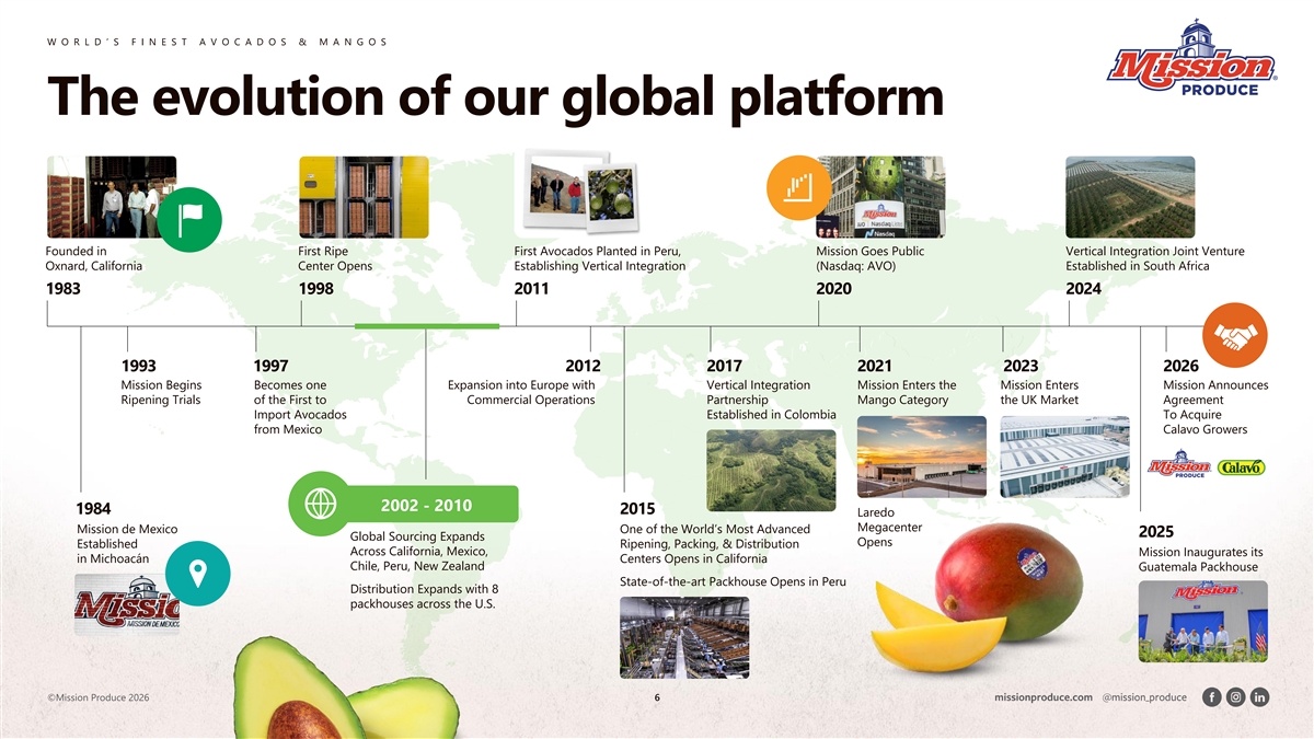 W O R L D ’ S F I N E S T A V O C A D O S & M A N G O S The evolution of our global platform Founded in First Ripe First Avocados Planted in Peru, Mission Goes Public Vertical Integration Joint Venture Oxnard, California Center Opens Establishing Vertical Integration (Nasdaq: AVO) Established in South Africa 1983 1998 2011 2020 2024 1993 1997 2012 2017 2021 2023 2026 Mission Begins Becomes one Expansion into Europe with Vertical Integration Mission Enters the Mission Enters Mission Announces Ripening Trials of the First to Commercial Operations Partnership Mango Category the UK Market Agreement Import Avocados Established in Colombia To Acquire from Mexico Calavo Growers 2002 - 2010 1984 2015 Laredo Megacenter Mission de Mexico One of the World’s Most Advanced 2025 Global Sourcing Expands Opens Established Ripening, Packing, & Distribution Across California, Mexico, Mission Inaugurates its in Michoacán Centers Opens in California Chile, Peru, New Zealand Guatemala Packhouse State-of-the-art Packhouse Opens in Peru Distribution Expands with 8 packhouses across the U.S. ©Mission Produce 2026 6