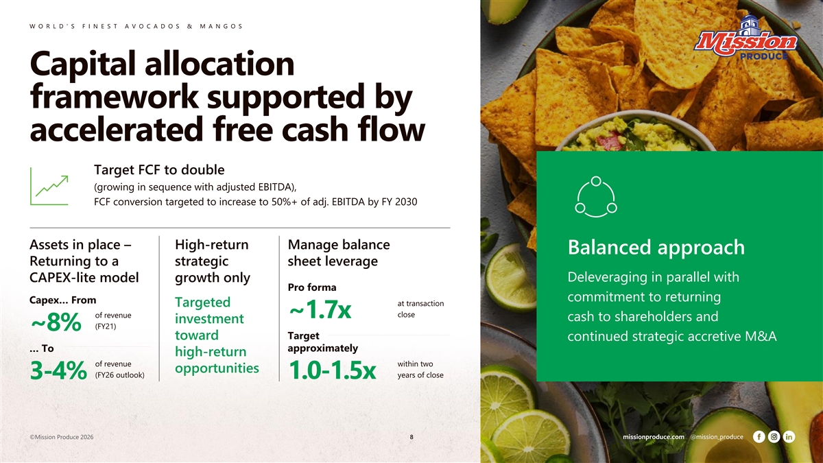 W O R L D ’ S F I N E S T A V O C A D O S & M A N G O S Looking ahead WHERE WE’VE BEEN WHERE WE ARE WHERE WE’RE GOING Global Optimizing network for improved Compelling catalyst infrastructure asset utilization and free cash flow generation Strategic growth complete Selectively adding new Current network Accelerating EBITDA categories to drive ROA facility utilization Harvesting cash flow Mangos/blueberries, and through Calavo Ample capacity to support future acquisition – Tomatoes/Papayas) to drive ROA volume growth Opportunity to increase pro-forma adjusted EBITDA by more than 2x by fiscal 2030 Includes Calavo and targeted synergies, as compared to FY25 levels ($111M) ©Mission Produce 2026 7