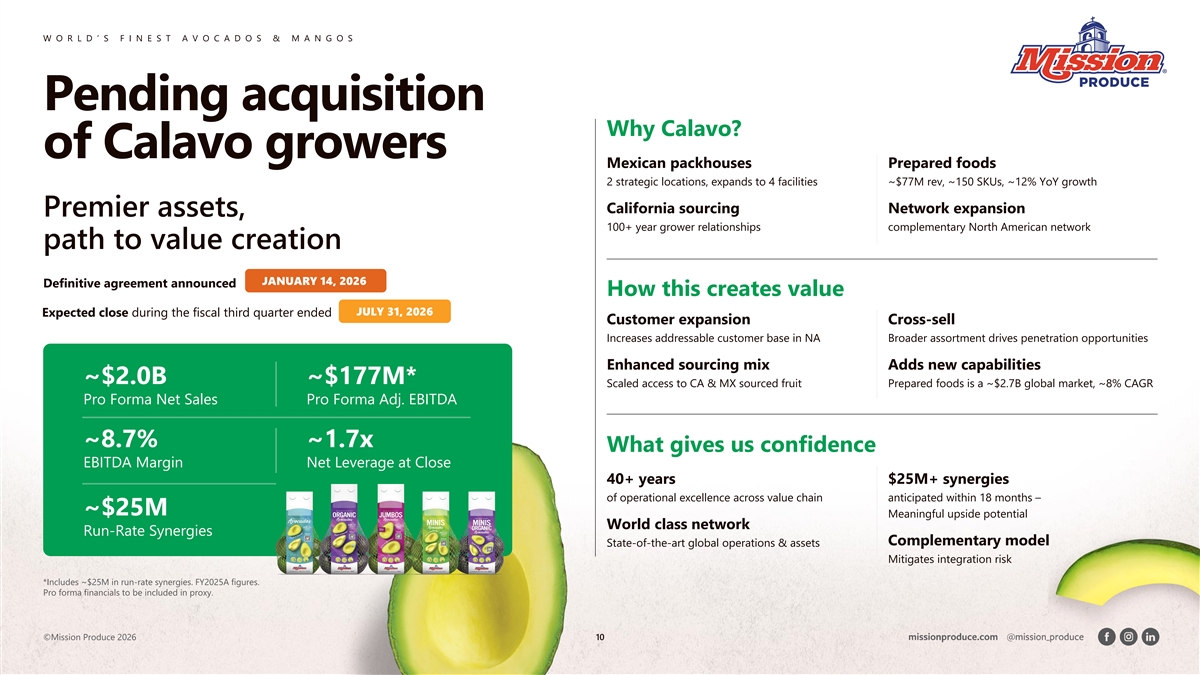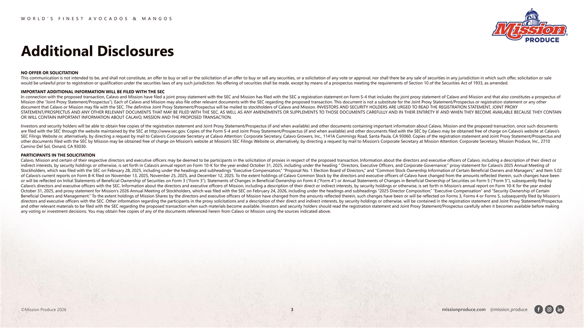 W O R L D ’ S F I N E S T A V O C A D O S & M A N G O S Additional Disclosures NO OFFER OR SOLICITATION This communication is not intended to be, and shall not constitute, an offer to buy or sell or the solicitation of an offer to buy or sell any securities, or a solicitation of any vote or approval, nor shall there be any sale of securities in any jurisdiction in which such offer, solicitation or sale would be unlawful prior to registration or qualification under the securities laws of any such jurisdiction. No offering of securities shall be made, except by means of a prospectus meeting the requirements of Section 10 of the Securities Act of 1933, as amended. IMPORTANT ADDITIONAL INFORMATION WILL BE FILED WITH THE SEC In connection with the proposed transaction, Calavo and Mission have filed a joint proxy statement with the SEC and Mission has filed with the SEC a registration statement on Form S-4 that includes the joint proxy statement of Calavo and Mission and that also constitutes a prospectus of Mission (the “Joint Proxy Statement/Prospectus”). Each of Calavo and Mission may also file other relevant documents with the SEC regarding the proposed transaction. This document is not a substitute for the Joint Proxy Statement/Prospectus or registration statement or any other document that Calavo or Mission may file with the SEC. The definitive Joint Proxy Statement/Prospectus will be mailed to stockholders of Calavo and Mission. INVESTORS AND SECURITY HOLDERS ARE URGED TO READ THE REGISTRATION STATEMENT, JOINT PROXY STATEMENT/PROSPECTUS AND ANY OTHER RELEVANT DOCUMENTS THAT MAY BE FILED WITH THE SEC, AS WELL AS ANY AMENDMENTS OR SUPPLEMENTS TO THOSE DOCUMENTS CAREFULLY AND IN THEIR ENTIRETY IF AND WHEN THEY BECOME AVAILABLE BECAUSE THEY CONTAIN OR WILL CONTAIN IMPORTANT INFORMATION ABOUT CALAVO, MISSION AND THE PROPOSED TRANSACTION. Investors and security holders will be able to obtain free copies of the registration statement and Joint Proxy Statement/Prospectus (if and when available) and other documents containing important information about Calavo, Mission and the proposed transaction, once such documents are filed with the SEC through the website maintained by the SEC at http://www.sec.gov. Copies of the Form S-4 and Joint Proxy Statement/Prospectus (if and when available) and other documents filed with the SEC by Calavo may be obtained free of charge on Calavo’s website at Calavo’s SEC Filings Website or, alternatively, by directing a request by mail to Calavo’s Corporate Secretary at Calavo Attention: Corporate Secretary, Calavo Growers, Inc., 1141A Cummings Road, Santa Paula, CA 93060. Copies of the registration statement and Joint Proxy Statement/Prospectus and other documents filed with the SEC by Mission may be obtained free of charge on Mission’s website at Mission’s SEC Filings Website or, alternatively, by directing a request by mail to Mission’s Corporate Secretary at Mission Attention: Corporate Secretary, Mission Produce, Inc., 2710 Camino Del Sol, Oxnard, CA 93030. PARTICIPANTS IN THE SOLICITATION Calavo, Mission and certain of their respective directors and executive officers may be deemed to be participants in the solicitation of proxies in respect of the proposed transaction. Information about the directors and executive officers of Calavo, including a description of their direct or indirect interests, by security holdings or otherwise, is set forth in Calavo’s annual report on Form 10-K for the year ended October 31, 2025, including under the heading “ Directors, Executive Officers, and Corporate Governance;” proxy statement for Calavo’s 2025 Annual Meeting of Stockholders, which was filed with the SEC on February 28, 2025, including under the headings and subheadings “Executive Compensation,” “Proposal No. 1 Election Board of Directors,” and “Common Stock Ownership Information of Certain Beneficial Owners and Managers;” and Item 5.02 of Calavo’s current reports on Form 8-K filed on November 13, 2025, November 25, 2025, and December 12, 2025. To the extent holdings of Calavo Common Stock by the directors and executive officers of Calavo have changed from the amounts reflected therein, such changes have been or will be reflected on Initial Statements of Beneficial Ownership of Securities on Form 3 (“Form 3”), Statements of Changes in Beneficial Ownership on Form 4 (“Form 4”) or Annual Statements of Changes in Beneficial Ownership of Securities on Form 5 (“Form 5”), subsequently filed by Calavo’s directors and executive officers with the SEC. Information about the directors and executive officers of Mission, including a description of their direct or indirect interests, by security holdings or otherwise, is set forth in Mission’s annual report on Form 10-K for the year ended October 31, 2025, and proxy statement for Mission’s 2026 Annual Meeting of Stockholders, which was filed with the SEC on February 24, 2026, including under the headings and subheadings “2025 Director Composition,” “Executive Compensation” and “Security Ownership of Certain Beneficial Owners and Management.” To the extent holdings of Mission Shares by the directors and executive officers of Mission have changed from the amounts reflected therein, such changes have been or will be reflected on Forms 3, Forms 4 or Forms 5, subsequently filed by Mission’s directors and executive officers with the SEC. Other information regarding the participants in the proxy solicitations and a description of their direct and indirect interests, by security holdings or otherwise, will be contained in the registration statement and Joint Proxy Statement/Prospectus and other relevant materials to be filed with the SEC regarding the proposed transaction when such materials become available. Investors and security holders should read the registration statement and Joint Proxy Statement/Prospectus carefully when it becomes available before making any 
