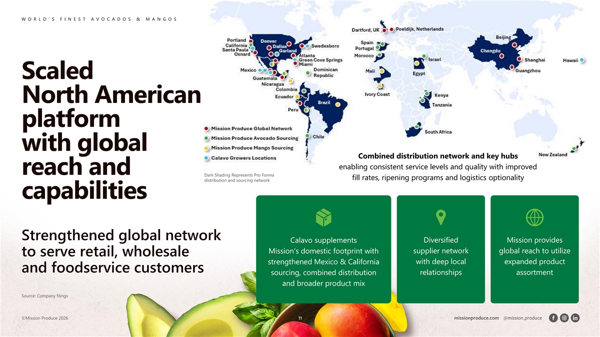 W O R L D ’ S F I N E S T A V O C A D O S & M A N G O S Pending acquisition Why Calavo? of Calavo growers Mexican packhouses Prepared foods 2 strategic locations, expands to 4 facilities ~$77M rev, ~150 SKUs, ~12% YoY growth California sourcing Network expansion Premier assets, 100+ year grower relationships complementary North American network path to value creation JANUARY 14, 2026 Definitive agreement announced How this creates value JULY 31, 2026 Expected close during the fiscal third quarter ended Customer expansion Cross-sell Increases addressable customer base in NA Broader assortment drives penetration opportunities Enhanced sourcing mix Adds new capabilities ~$2.0B ~$177M* Scaled access to CA & MX sourced fruit Prepared foods is a ~$2.7B global market, ~8% CAGR Pro Forma Net Sales Pro Forma Adj. EBITDA ~8.7% ~1.7x What gives us confidence EBITDA Margin Net Leverage at Close 40+ years $25M+ synergies of operational excellence across value chain anticipated within 18 months – ~$25M Meaningful upside potential World class network Run-Rate Synergies Complementary model State-of-the-art global operations & assets Mitigates integration risk *Includes ~$25M in run-rate synergies. FY2025A figures. Pro forma financials to be included in proxy. ©Mission Produce 2026 10