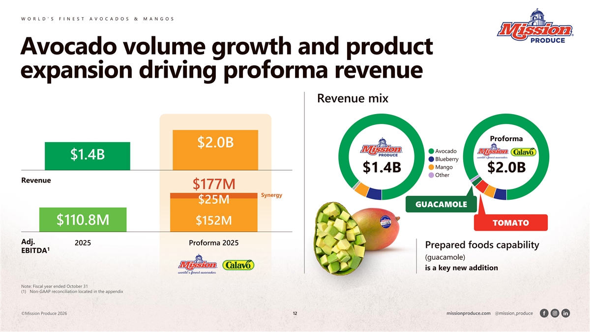 W O R L D ’ S F I N E S T A V O C A D O S & M A N G O S Scaled North American platform with global Combined distribution network and key hubs enabling consistent service levels and quality with improved reach and Dark Shading Represents Pro Forma fill rates, ripening programs and logistics optionality distribution and sourcing network capabilities Strengthened global network Diversified Mission provides Calavo supplements Mission’s domestic footprint with supplier network global reach to utilize to serve retail, wholesale with deep local expanded product strengthened Mexico & California and foodservice customers sourcing, combined distribution relationships assortment and broader product mix Source: Company filings ©Mission Produce 2026 11