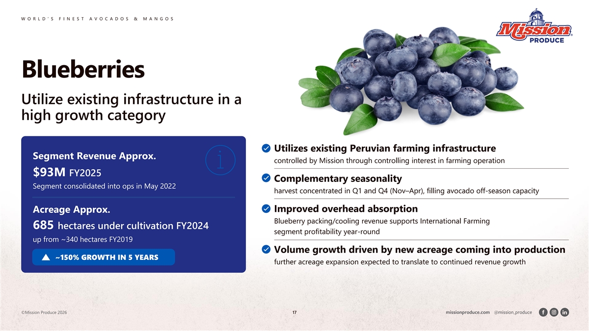 W O R L D ’ S F I N E S T A V O C A D O S & M A N G O S Utilize infrastructure for Mangos category expansion We utilize our vertical integration in Peru and international growing partnerships to access the top mango varieties around the world. Minimal Facility Cross-selling Complementary incremental utilization success seasonality CAPEX improvement 47% of avocado fills fiscal second utilizing existing Mangos drove shoppers & third quarter facilities and ~15% higher also purchase capacity gaps distribution volume through mangos network distribution network 1 Market share Revenue 6.4% $86M From 1.5% (FY2021) (1) National Mango Board ©Mission Produce 2026 16 FY2025