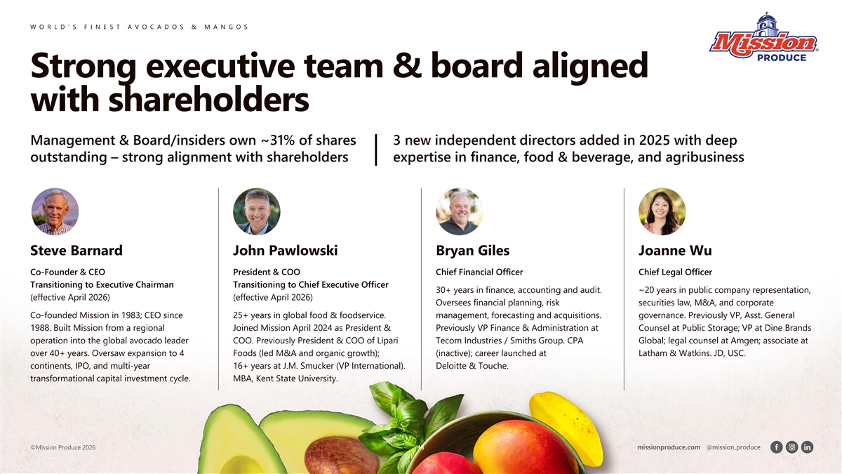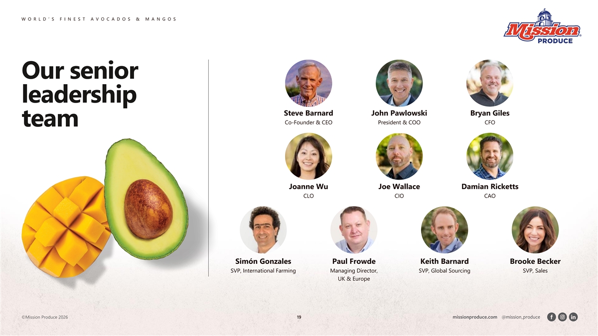 W O R L D ’ S F I N E S T A V O C A D O S & M A N G O S Strong executive team & board aligned with shareholders Management & Board/insiders own ~31% of shares 3 new independent directors added in 2025 with deep outstanding – strong alignment with shareholders expertise in finance, food & beverage, and agribusiness Steve Barnard John Pawlowski Bryan Giles Joanne Wu Co-Founder & CEO President & COO Chief Financial Officer Chief Legal Officer Transitioning to Executive Chairman Transitioning to Chief Executive Officer 30+ years in finance, accounting and audit. ~20 years in public company representation, (effective April 2026) (effective April 2026) Oversees financial planning, risk securities law, M&A, and corporate Co-founded Mission in 1983; CEO since 25+ years in global food & foodservice. management, forecasting and acquisitions. governance. Previously VP, Asst. General 1988. Built Mission from a regional Joined Mission April 2024 as President & Previously VP Finance & Administration at Counsel at Public Storage; VP at Dine Brands operation into the global avocado leader COO. Previously President & COO of Lipari Tecom Industries / Smiths Group. CPA Global; legal counsel at Amgen; associate at over 40+ years. Oversaw expansion to 4 Foods (led M&A and organic growth); (inactive); career launched at Latham & Watkins. JD, USC. continents, IPO, and multi-year 16+ years at J.M. Smucker (VP International). Deloitte & Touche. transformational capital investment cycle. MBA, Kent State University. ©Mission Produce 2026 18