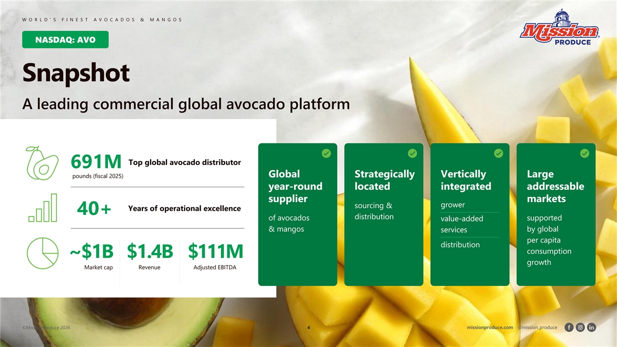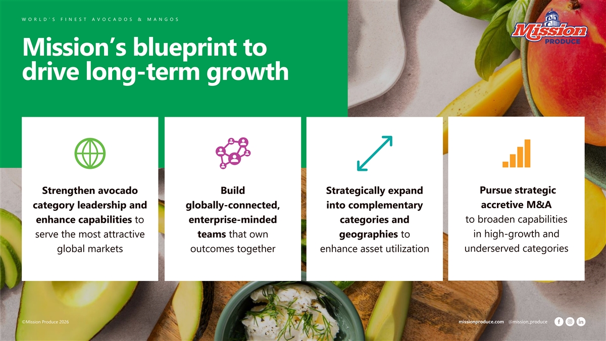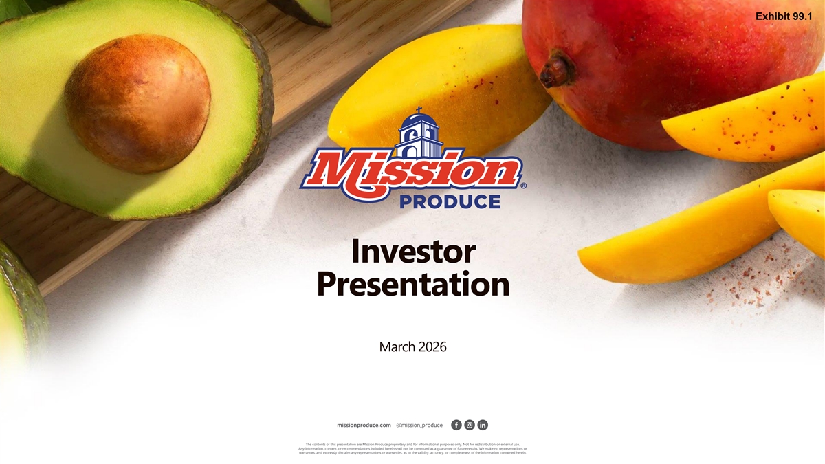 Exhibit 99.1 Investor Presentation March 2026 The contents of this presentation are Mission Produce proprietary and for informational purposes only. Not for redistribution or external use. Any information, content, or recommendations included herein shall not be construed as a guarantee of future results. We make no representations or warranties, and expressly disclaim any representations or warranties, as to the validity, accuracy, or completeness of the information contained herein.