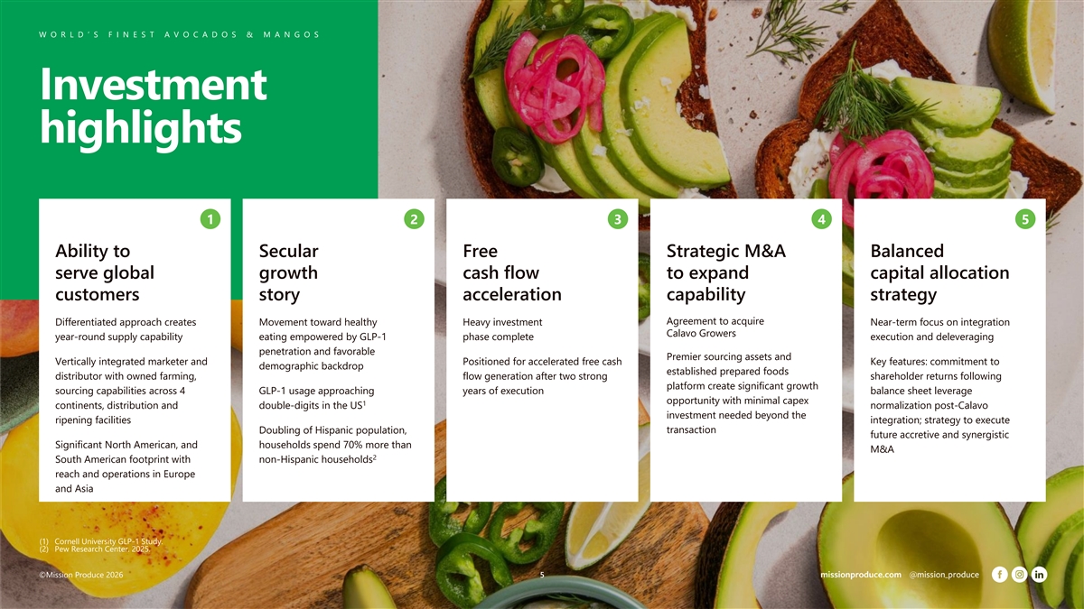 W W O O R R L L D D ’’ S S F F II N N E E S S T T A A V V O O C C A A D D O O S S & & M M A A N N G G O O S S NASDAQ: AVO Snapshot A leading commercial global avocado platform Top global avocado distributor 691M Global Strategically Vertically Large pounds (fiscal 2025) year-round located integrated addressable supplier markets grower sourcing & Years of operational excellence 40+ distribution of avocados supported value-added & mangos by global services per capita distribution consumption ~$1B $1.4B $111M growth Market cap Revenue Adjusted EBITDA ©Mission Produce 2026 4