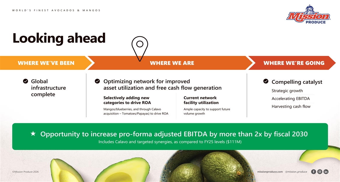 W O R L D ’ S F I N E S T A V O C A D O S & M A N G O S The evolution of our global platform Founded in First Ripe First Avocados Planted in Peru, Mission Goes Public Vertical Integration Joint Venture Oxnard, California Center Opens Establishing Vertical Integration (Nasdaq: AVO) Established in South Africa 1983 1998 2011 2020 2024 1993 1997 2012 2017 2021 2023 2026 Mission Begins Becomes one Expansion into Europe with Vertical Integration Mission Enters the Mission Enters Mission Announces Ripening Trials of the First to Commercial Operations Partnership Mango Category the UK Market Agreement Import Avocados Established in Colombia To Acquire from Mexico Calavo Growers 2002 - 2010 1984 2015 Laredo Megacenter Mission de Mexico One of the World’s Most Advanced 2025 Global Sourcing Expands Opens Established Ripening, Packing, & Distribution Across California, Mexico, Mission Inaugurates its in Michoacán Centers Opens in California Chile, Peru, New Zealand Guatemala Packhouse State-of-the-art Packhouse Opens in Peru Distribution Expands with 8 packhouses across the U.S. ©Mission Produce 2026 6