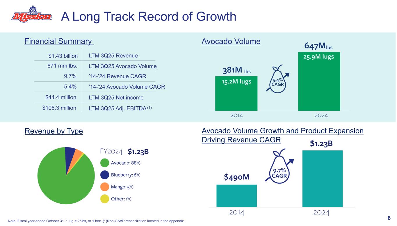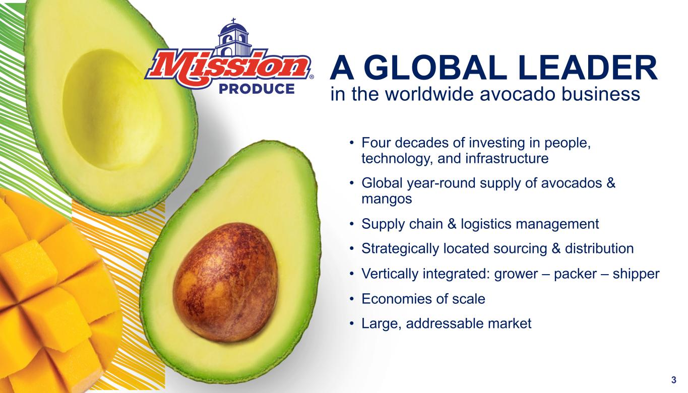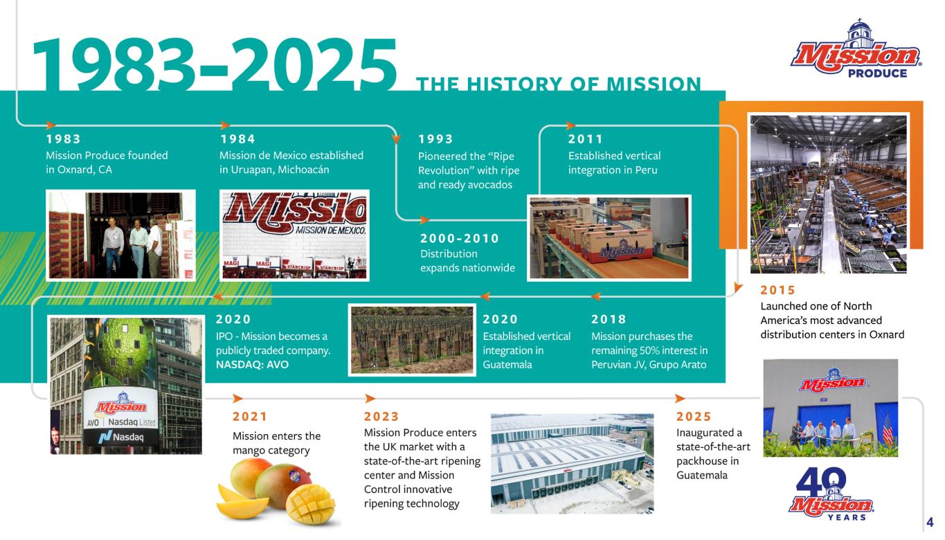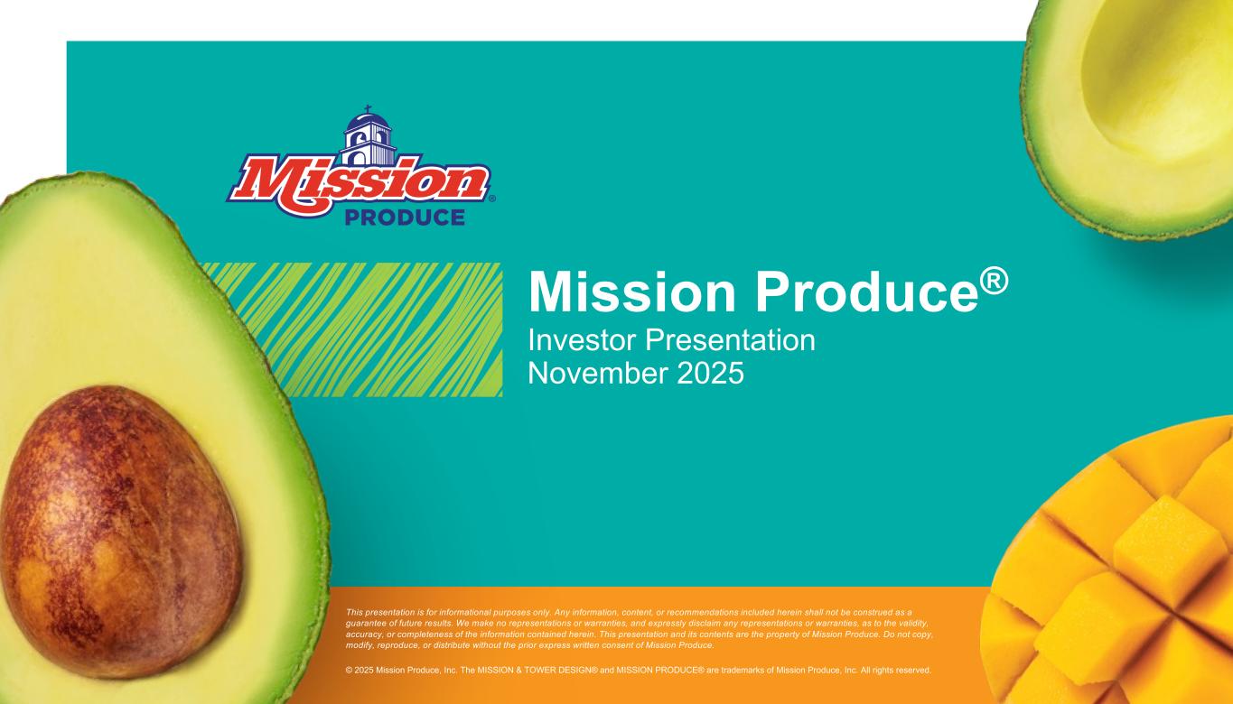 Investor Presentation November 2025 Mission Produce® © 2025 Mission Produce, Inc. The MISSION & TOWER DESIGN® and MISSION PRODUCE® are trademarks of Mission Produce, Inc. All rights reserved. This presentation is for informational purposes only. Any information, content, or recommendations included herein shall not be construed as a guarantee of future results. We make no representations or warranties, and expressly disclaim any representations or warranties, as to the validity, accuracy, or completeness of the information contained herein. This presentation and its contents are the property of Mission Produce. Do not copy, modify, reproduce, or distribute without the prior express written consent of Mission Produce.