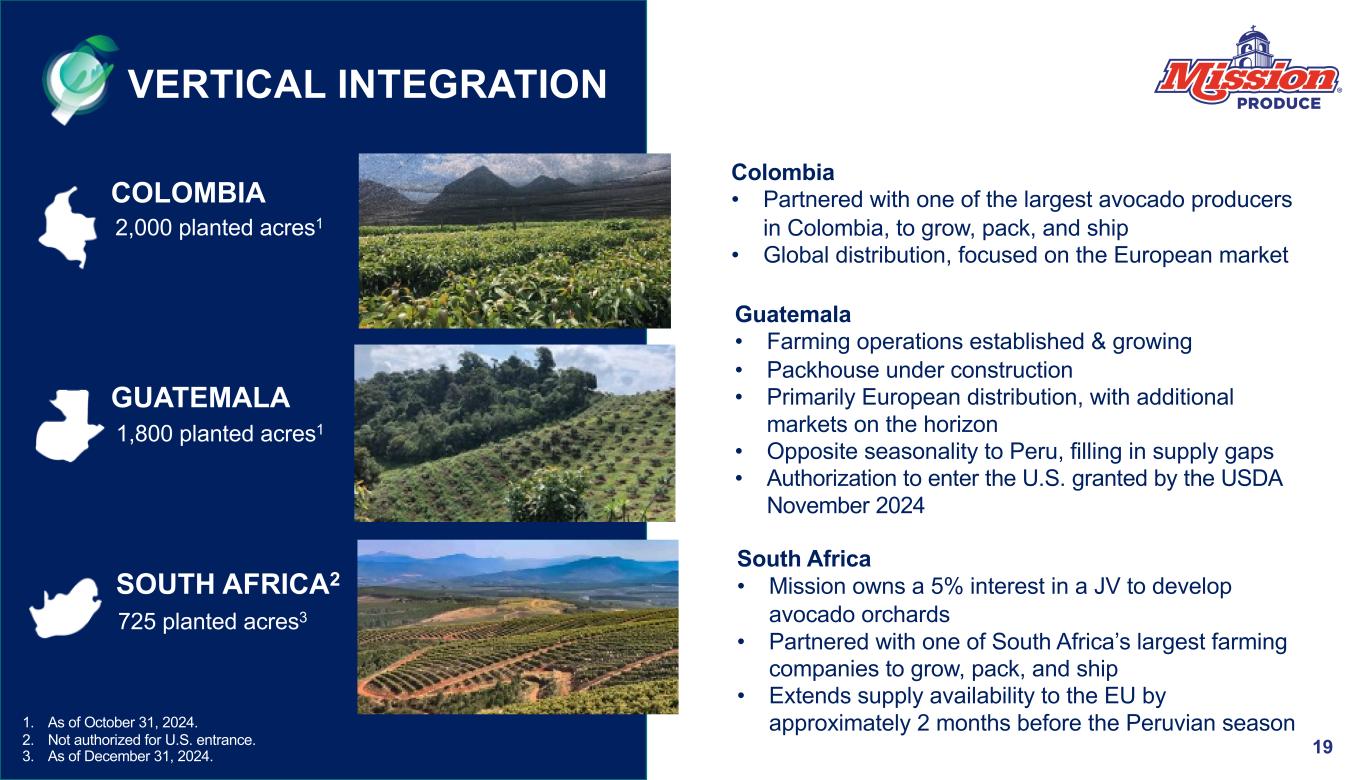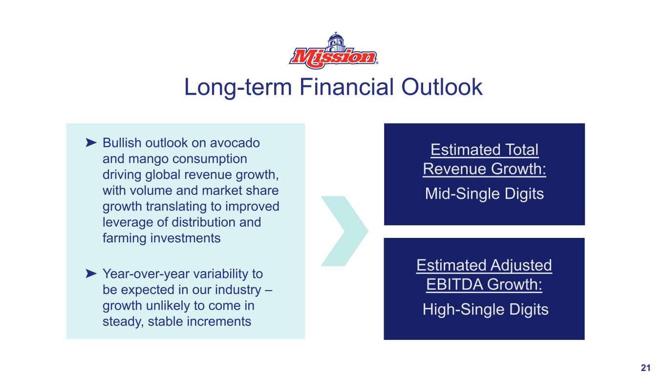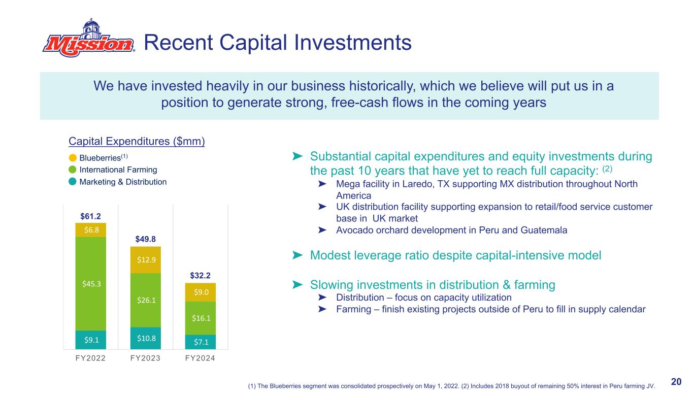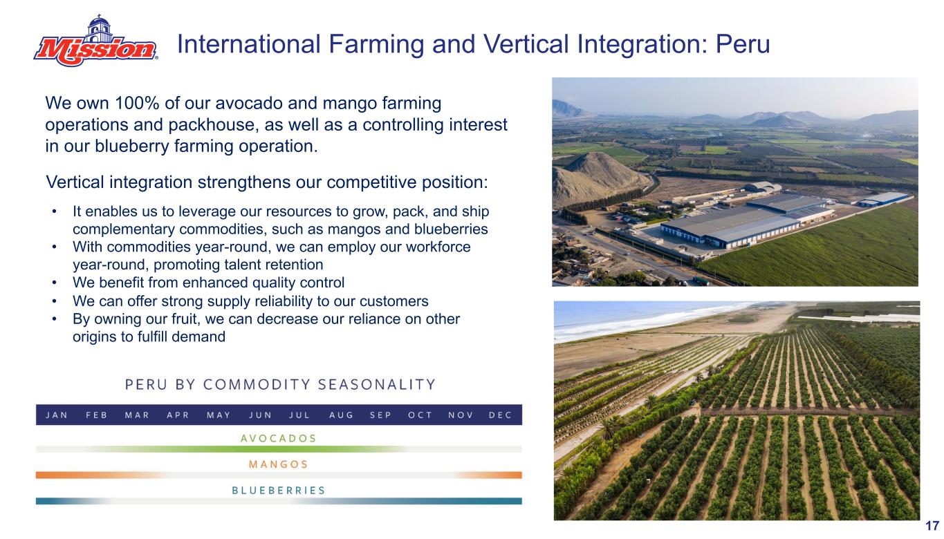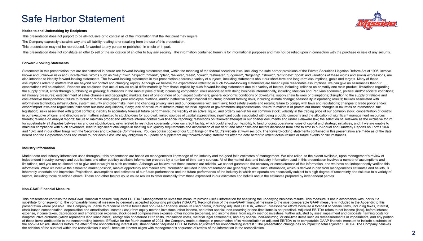Notice to and Undertaking by Recipients This presentation does not purport to be all-inclusive or to contain all of the information that the Recipient may require. The Company expressly disclaims any and all liability relating to or resulting from the use of this presentation. This presentation may not be reproduced, forwarded to any person or published, in whole or in part. This presentation does not constitute an offer to sell or the solicitation of an offer to buy any security. The information contained herein is for informational purposes and may not be relied upon in connection with the purchase or sale of any security. Forward-Looking Statements Statements in this presentation that are not historical in nature are forward-looking statements that, within the meaning of the federal securities laws, including the safe harbor provisions of the Private Securities Litigation Reform Act of 1995, involve known and unknown risks and uncertainties. Words such as "may", "will", "expect", "intend", "plan", "believe", "seek", "could", "estimate", "judgment", "targeting", "should", "anticipate", "goal" and variations of these words and similar expressions, are also intended to identify forward-looking statements. The forward-looking statements in this presentation address a variety of subjects, including statements about our short-term and long-term assumptions, goals and targets. Many of these assumptions relate to matters that are beyond our control and changing rapidly. Although we believe the expectations reflected in such forward-looking statements are based upon reasonable assumptions, we can give no assurances that our expectations will be attained. Readers are cautioned that actual results could differ materially from those implied by such forward-looking statements due to a variety of factors, including: reliance on primarily one main product, limitations regarding the supply of fruit, either through purchasing or growing; fluctuations in the market price of fruit; increasing competition; risks associated with doing business internationally, including Mexican and Peruvian economic, political and/or societal conditions; inflationary pressures; establishment of sales channels and geographic markets; loss of one or more of our largest customers; general economic conditions or downturns; supply chain failures or disruptions; disruption to the supply of reliable and cost-effective transportation; failure to recruit or retain employees, poor employee relations, and/or ineffective organizational structure; inherent farming risks, including climate change; seasonality in operating results; failures associated with information technology infrastructure, system security and cyber risks; new and changing privacy laws and our compliance with such laws; food safety events and recalls; failure to comply with laws and regulations; changes to trade policy and/or export/import laws and regulations; risks from business acquisitions, if any; lack of or failure of infrastructure; material litigation or governmental inquiries/actions; failure to maintain or protect our brand; changes in tax rates or international tax legislation; risks associated with global conflicts; inability to accurately forecast future performance; the viability of an active, liquid, and orderly market for our common stock; volatility in the trading price of our common stock; concentration of control in our executive officers, and directors over matters submitted to stockholders for approval; limited sources of capital appreciation; significant costs associated with being a public company and the allocation of significant management resources thereto; reliance on analyst reports; failure to maintain proper and effective internal control over financial reporting; restrictions on takeover attempts in our charter documents and under Delaware law; the selection of Delaware as the exclusive forum for substantially all disputes between us and our stockholders; risks related to restrictive covenants under our credit facility, which could affect our flexibility to fund ongoing operations, uses of capital and strategic initiatives, and, if we are unable to maintain compliance with such covenants, lead to significant challenges in meeting our liquidity requirements and acceleration of our debt; and other risks and factors discussed from time to time in our Annual and Quarterly Reports on Forms 10-K and 10-Q and in our other filings with the Securities and Exchange Commission. You can obtain copies of our SEC filings on the SEC’s website at www.sec.gov. The forward-looking statements contained in this presentation are made as of the date hereof and the Corporation does not intend to, nor does it assume any obligation to, update or supplement any forward-looking statements after the date hereof to reflect actual results or future events or circumstances. Industry Information Market data and industry information used throughout this presentation are based on management's knowledge of the industry and the good faith estimates of management. We also relied, to the extent available, upon management's review of independent industry surveys and publications and other publicly available information prepared by a number of third-party sources. All of the market data and industry information used in this presentation involves a number of assumptions and limitations, and you are cautioned not to give undue weight to such estimates. Although we believe that these sources are reliable, we cannot guarantee the accuracy or completeness of this information, and we have not independently verified this information. While we believe the estimated market position, market opportunity and market size information included in this presentation are generally reliable, such information, which is derived in part from management's estimates and beliefs, is inherently uncertain and imprecise. Projections, assumptions and estimates of our future performance and the future 