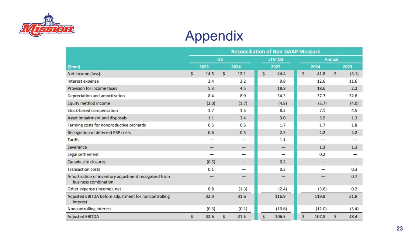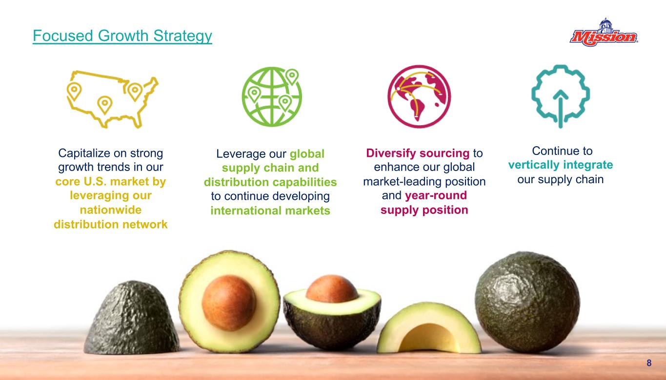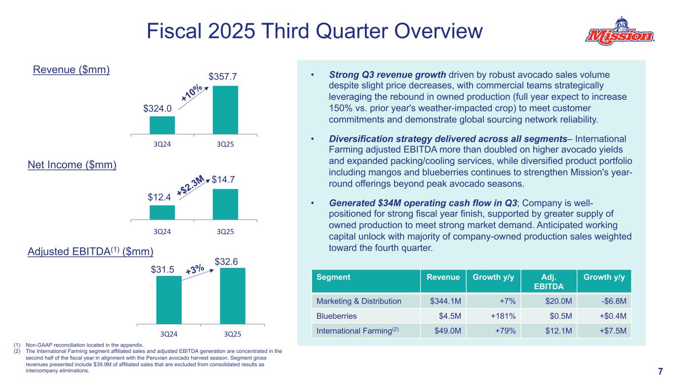7 Fiscal 2025 Third Quarter Overview Revenue ($mm) Net Income ($mm) • Strong Q3 revenue growth driven by robust avocado sales volume despite slight price decreases, with commercial teams strategically leveraging the rebound in owned production (full year expect to increase 150% vs. prior year's weather-impacted crop) to meet customer commitments and demonstrate global sourcing network reliability. • Diversification strategy delivered across all segments– International Farming adjusted EBITDA more than doubled on higher avocado yields and expanded packing/cooling services, while diversified product portfolio including mangos and blueberries continues to strengthen Mission's year- round offerings beyond peak avocado seasons. • Generated $34M operating cash flow in Q3; Company is well- positioned for strong fiscal year finish, supported by greater supply of owned production to meet strong market demand. Anticipated working capital unlock with majority of company-owned production sales weighted toward the fourth quarter. Segment Revenue Growth y/y Adj. EBITDA Growth y/y Marketing & Distribution $344.1M +7% $20.0M -$6.8M Blueberries $4.5M +181% $0.5M +$0.4M International Farming(2) $49.0M +79% $12.1M +$7.5M Adjusted EBITDA(1) ($mm) 3Q24 3Q25 +10 % $324.0 3Q24 3Q25 $357.7 $32.6 $31.5 +3% 3Q24 3Q25 $12.4 $14.7 +$2 .3M (1) Non-GAAP reconciliation located in the appendix. (2) The International Farming segment affiliated sales and adjusted EBITDA generation are concentrated in the second half of the fiscal year in alignment with the Peruvian avocado harvest season. Segment gross revenues presented include $39.9M of affiliated sales that are excluded from consolidated results as intercompany eliminations.