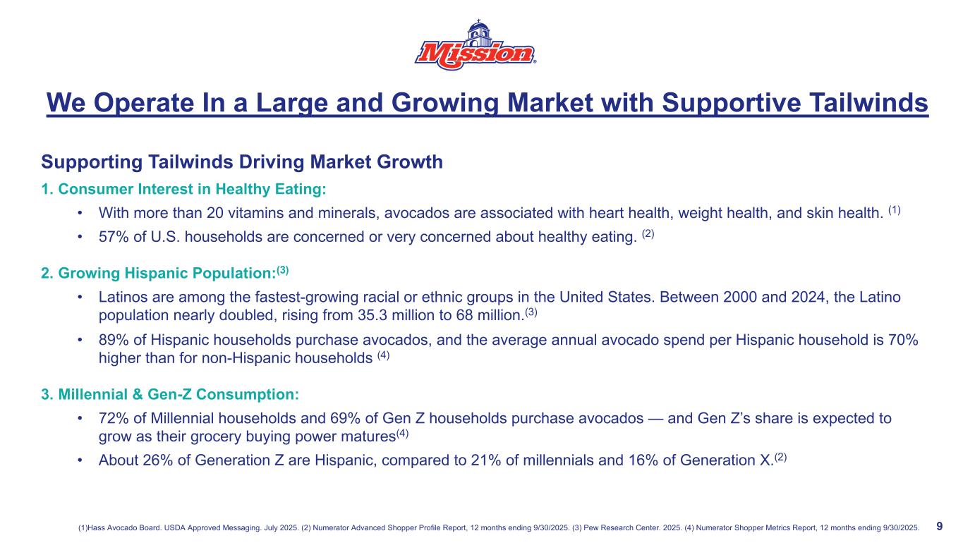 Supporting Tailwinds Driving Market Growth 1. Consumer Interest in Healthy Eating: • With more than 20 vitamins and minerals, avocados are associated with heart health, weight health, and skin health. (1) • 57% of U.S. households are concerned or very concerned about healthy eating. (2) 2. Growing Hispanic Population:(3) • Latinos are among the fastest-growing racial or ethnic groups in the United States. Between 2000 and 2024, the Latino population nearly doubled, rising from 35.3 million to 68 million.(3) • 89% of Hispanic households purchase avocados, and the average annual avocado spend per Hispanic household is 70% higher than for non-Hispanic households (4) 3. Millennial & Gen-Z Consumption: • 72% of Millennial households and 69% of Gen Z households purchase avocados — and Gen Z’s share is expected to grow as their grocery buying power matures(4) • About 26% of Generation Z are Hispanic, compared to 21% of millennials and 16% of Generation X.(2) We Operate In a Large and Growing Market with Supportive Tailwinds (1)Hass Avocado Board. USDA Approved Messaging. July 2025. (2) Numerator Advanced Shopper Profile Report, 12 months ending 9/30/2025. (3) Pew Research Center. 2025. (4) Numerator Shopper Metrics Report, 12 months ending 9/30/2025. 9