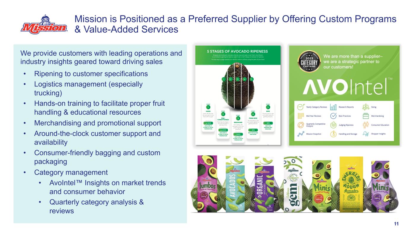 State-of-the-Art Infrastructure Covering U.S. Markets Packhouse Advantages ➤ High-definition grading cameras ➤ State-of-the-art washing, sorting, packing, and bagging line ➤ Industry-leading post- harvest practices (cold chain) ➤ Ocean container plug-ins Forward Distribution and Ripening Center Advantages ➤ Ability to ripen to customer specification ➤ Ability to store and deliver volume opportunistically as customer demand evolves ➤ Proximity to clients 10