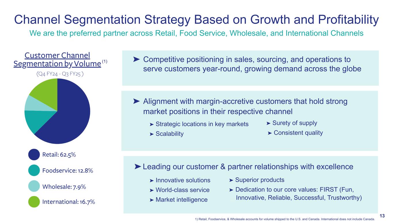 Channel Segmentation Strategy Based on Growth and Profitability We are the preferred partner across Retail, Food Service, Wholesale, and International Channels ➤Leading our customer & partner relationships with excellence ➤ Competitive positioning in sales, sourcing, and operations to serve customers year-round, growing demand across the globe ➤ Alignment with margin-accretive customers that hold strong market positions in their respective channel ➤ Strategic locations in key markets ➤ Scalability ➤ Surety of supply ➤ Consistent quality 13 ➤ Innovative solutions ➤ World-class service ➤ Market intelligence ➤ Superior products ➤ Dedication to our core values: FIRST (Fun, __Innovative, Reliable, Successful, Trustworthy) (1) 1) Retail, Foodservice, & Wholesale accounts for volume shipped to the U.S. and Canada. International does not include Canada.