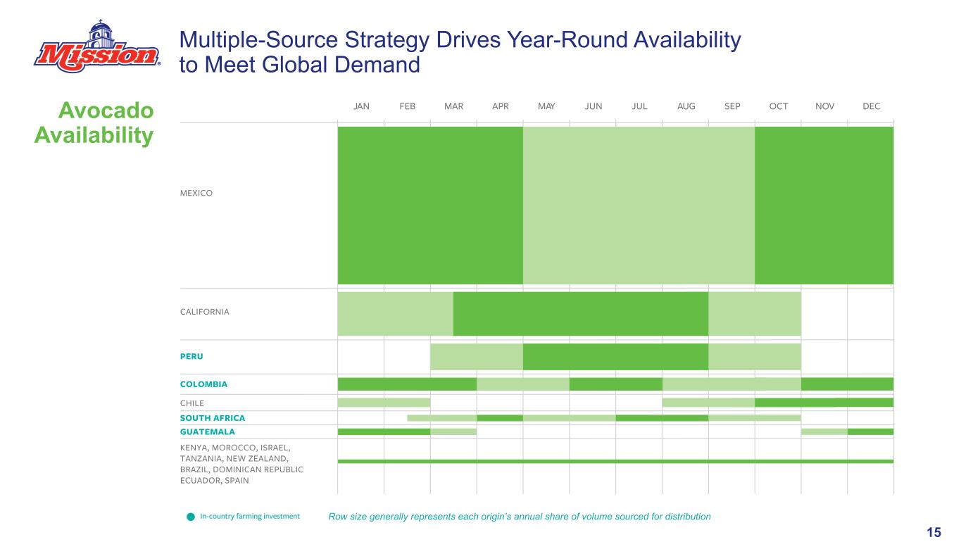 (1) World Avocado Organization. Avocado World Statistics Yearbook. 2024-25. (2) USDA Avocado Annual Report. April 1, 2025. (3) Calculation basis for China: imports calculated on the basis of exports from supplier countries; population considered: households with more than $2150 USD/month. Global Avocado Consumption is Poised to Grow 2024 Global Per Capita Consumption (1) Mission is driving year-round availability in international markets to meet growing demand International Growth Opportunity: ➤ Increasing global availability ➤ Increasing household penetration ➤ Innovation & expansion of logistics & production Competitive International Positioning: ➤ Meeting gaps in supply with increasing exports ➤ Increasing international distribution in key markets ➤ Expanding international customer base in EU & Asia 14