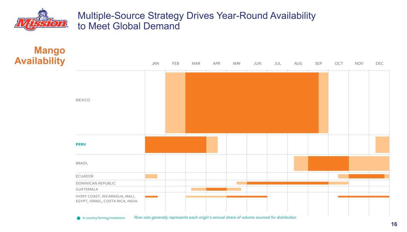 Multiple-Source Strategy Drives Year-Round Availability to Meet Global Demand 15 Avocado Availability Row size generally represents each origin’s annual share of volume sourced for distribution MEXICO PERU CALIFORNIA SOUTH AFRICA KENYA, MOROCCO, ISRAEL, TANZANIA, NEW ZEALAND, BRAZIL, DOMINICAN REPUBLIC ECUADOR, SPAIN COLOMBIA GUATEMALA CHILE Avocados–Global Availability JAN FEB MAR APR MAY JUN JUL AUG SEP OCT NOV DEC Let’s Connect! missionproduce.com @mission_produce Stronger bar color denotes higher volume. Transition periods can vary slightly dependent on weather, growing conditions, etc. Not all origins have access to all markets.Vertically Integrated growing locations