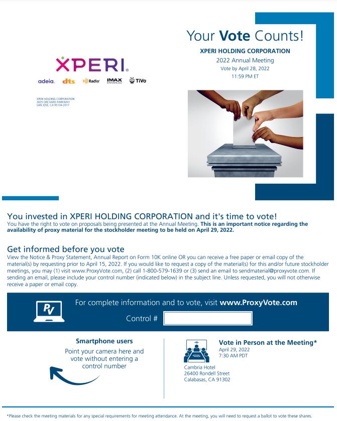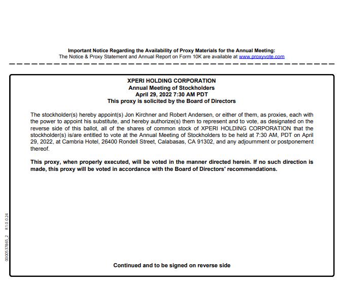 Important Notice Regarding the Availability of Proxy Materials for the Annual Meeting: The Notice & Proxy Statement and Annual Report on Form 10K are available at www.proxyvote.com XPERI HOLDING CORPORATION Annual Meeting of Stockholders April 29, 2022 7:30 AM PDT This proxy is solicited by the Board of Directors The stockholder(s) hereby appoint(s) Jon Kirchner and Robert Andersen, or either of them, as proxies, each with the power to appoint his substitute, and hereby authorize(s) them to represent and to vote, as designated on the reverse side of this ballot, all of the shares of common stock of XPERI HOLDING CORPORATION that the stockholder(s) is/are entitled to vote at the Annual Meeting of Stockholders to be held at 7:30 AM, PDT on April 29, 2022, at Cambria Hotel, This proxy, when properly executed, will be voted in the manner directed herein. If no such direction is made, this proxy will be voted in accordance with the Board of Directors' recommendations.26400 Rondell Street, Calabasas, CA 91302, and any adjournment or postponement thereof. 0000537865_2 R1.0.0.24 Continued and to be signed on reverse side
