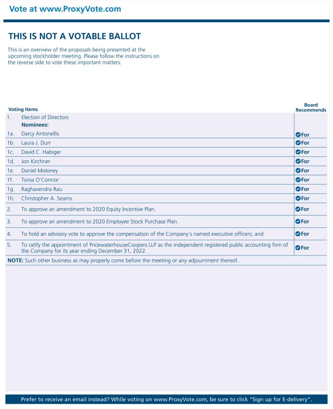 Vote at www.proxy vote.com this is not a votable ballot This is an overview of the proposals being presented at the upcoming stockholder meeting please follow the instruction on the reverse side to vote these important matters. Voting item 1 election of directors nominees 1a darcy antonellis 1b laura j durr 1c David c. Habiger 1d jon kricher 1e Daniel Moloney 1f tonia o connor 1g Raghavendra rau 1h Christopher a seams To approve an amendment to 2020 equity incentive plan. To approve an amendment to 2020 employee stock purchase plan to hold an advisory vote approve the compensation of the companys named executive officers and the company fir its year ending Decembers 31 2022. For For For For For For For For For For For For. Note such other business as may properly come before the meeting or any adjournment thereof.