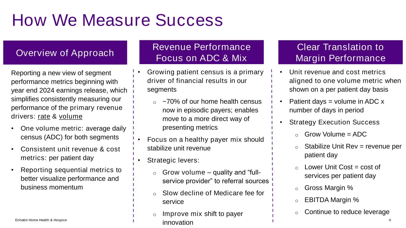 Enhabit Home Health & Hospice 2 Disclaimer Forward looking statements This presentation contains historical information, as well as forward-looking statements (within the meaning of Section 27A of the Securities Act of 1933, as amended, and Section 21E of the Securities Exchange Act of 1934, as amended (the “Exchange Act”)) that involve known and unknown risks and relate to, among other things, future events, projections, financial guidance, legislative or regulatory developments, strategy or growth opportunities, our future financial performance, our projected business results, or our projected capital expenditures. All statements other than statements of historical fact are, or may be deemed to be, forward-looking statements. In some cases, the reader can identify forward-looking statements by terminology such as “may,” “will,” “should,” “could,” “expects,” “plans,” “anticipates,” “believes,” “estimates,” “predicts,” “targets,” “potential,” or “continue” or the negative of these terms or other comparable terminology. Any forward-looking statement speaks only as of the date of this presentation, and the Company undertakes no duty to publicly update or revise such forward-looking information, whether as a result of new information, future events, or otherwise. Such forward-looking statements are necessarily estimates based upon current information and involve a number of risks and uncertainties, many of which are beyond our control. Actual events or results may differ materially from the results anticipated in these forward-looking statements as a result of a variety of factors. While it is impossible to identify all such factors, factors which could cause actual events or results to differ materially from those estimated by the Company include, but are not limited to, our ability to execute on our strategic plans; regulatory and other developments impacting the markets for our services; changes in reimbursement rates; general economic conditions; changes in the episodic versus non-episodic mix of our payers, the case mix of our patients, and payment methodologies; our ability to attract and retain key management personnel and healthcare professionals; potential disruptions or breaches of our or our vendors’, payers’, and other contract counterparties’ information systems; the outcome of litigation; quality performance and ratings; our ability to successfully complete and integrate de novo locations, acquisitions, investments, and joint ventures; our ability to successfully integrate technology in our operations; and our ability to control costs, particularly labor and employee benefit costs. Additional information regarding risks and factors that could cause actual results to differ materially from those expressed or implied by any forward-looking statement in this presentation are described in reports filed with the SEC, including our annual report on Form 10-K and subsequent quarterly reports on Form 10-Q, copies of which are available on the Company's website at http://investors.ehab.com. Note regarding presentation of non-GAAP financial measures This presentation includes certain “non-GAAP financial measures” as defined in Regulation G under the Exchange Act, including Adjusted EBITDA and Adjusted EBITDA margin. Reconciliations of these non-GAAP financial measures to the most directly comparable financial measures calculated in accordance with GAAP are presented in our Form 8-K, filed with the SEC on May 7, 2025. It provides further explanation and disclosure regarding Enhabit’s use of non-GAAP financial measures and should be read in conjunction with this presentation. Note regarding presentation of same-store comparisons The Company uses “same-store” comparisons to explain the changes in certain performance metrics and line items within its financial statements. Same-store comparisons are calculated based on home health and hospice locations open throughout both the full current period and the immediately prior period presented. These comparisons include the financial results of market consolidation transactions in existing markets, as it is difficult to determine, with precision, the incremental impact of these transactions on the Company’s results of operations.