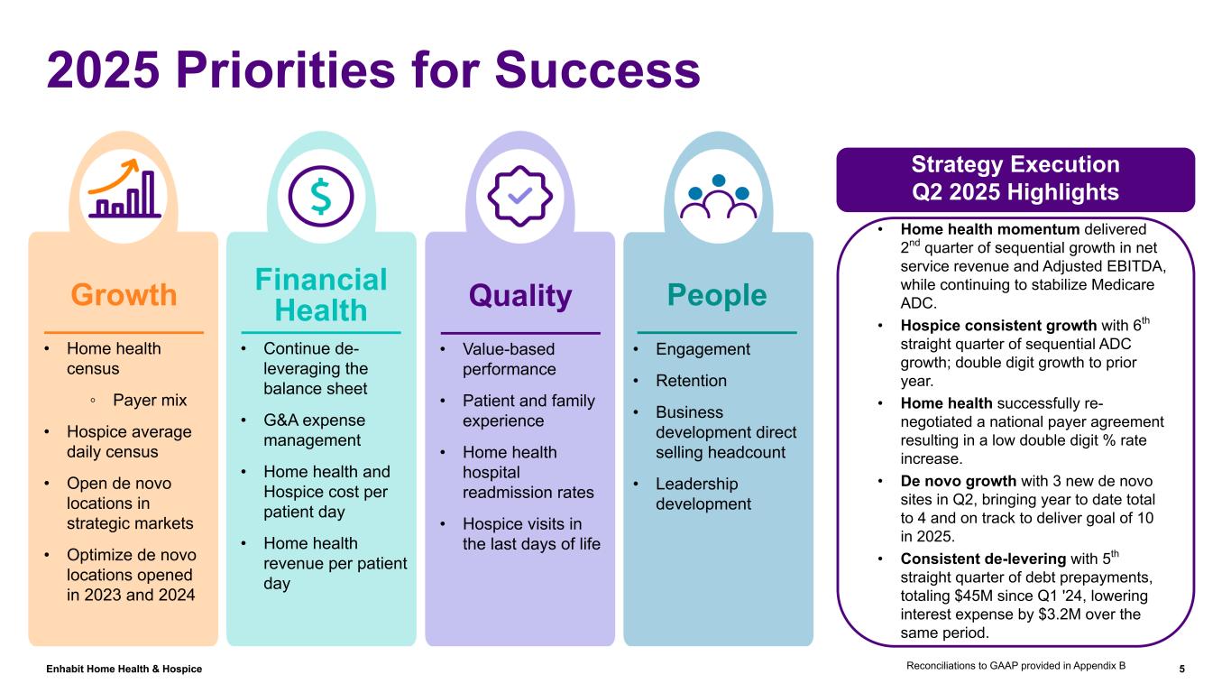 Enhabit Home Health & Hospice 4 Overview 108 Hospice locations co-located with Home Health locations(1) Home Health Locations Hospice Locations Home Health & Hospice State Home Health Only State (1) As of June 30, 2025 - due to scale, not all locations can be represented by locational markers 114 Hospice locations(1) 249 Home Health locations(1) We are a leading provider of home health and hospice services that strives to provide superior, cost-effective care where patients prefer it: in their homes For over 25 years, we've provided care with high-quality outcomes becoming a trusted partner of health systems, payers and other risk-bearing entities We operate nationally across 34 states with approximately 10,600 employees We foster an award-winning culture that is a strategic advantage in attracting and retaining talent and a main contributor to our continued success 4 Home Health (1) and Hospice (3) de novo locations opened in 2025 Hospice Only State