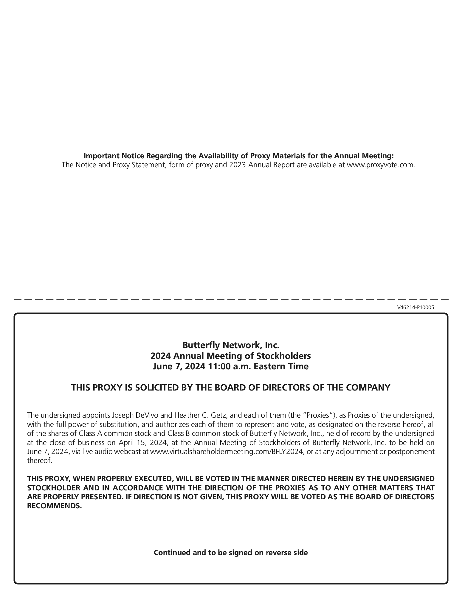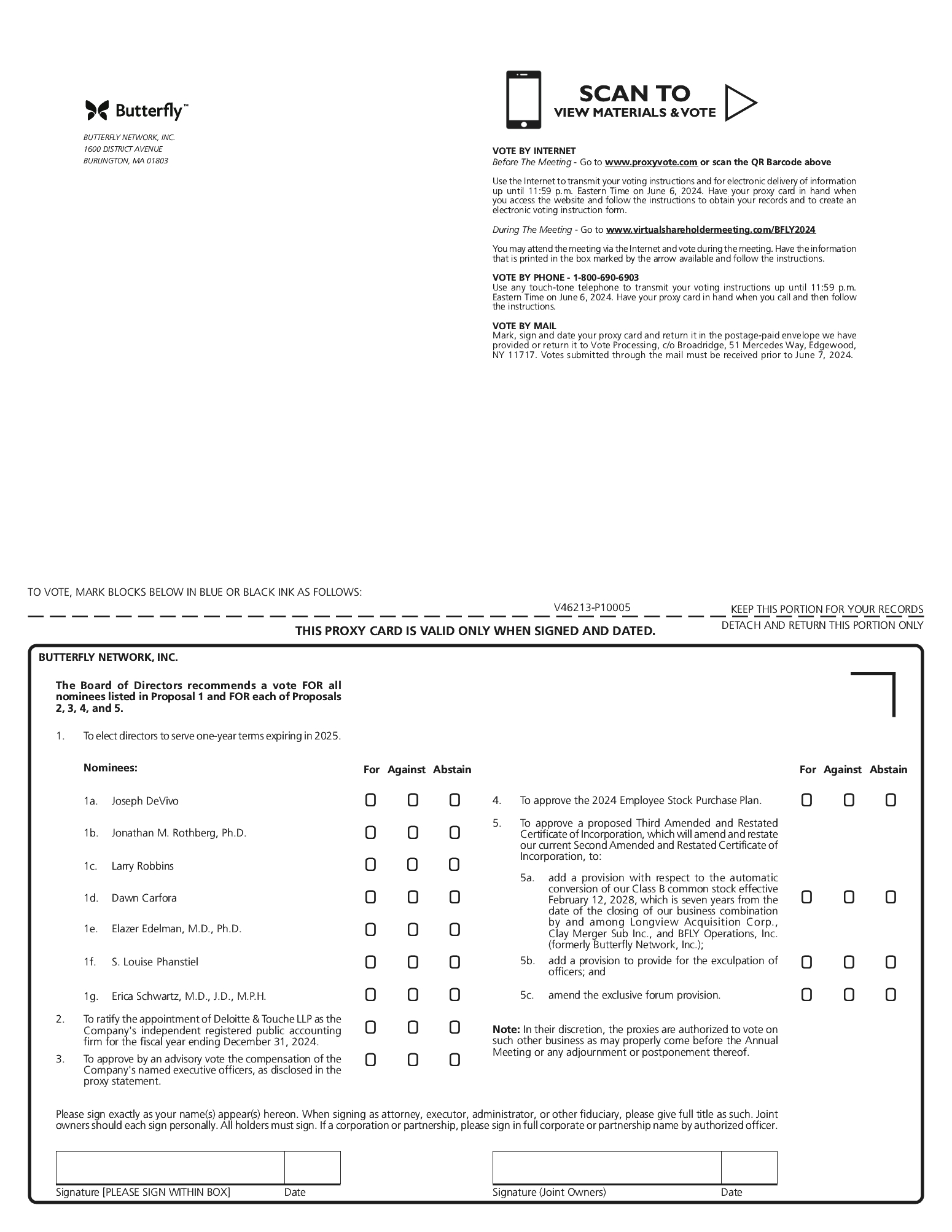 ACCESS: | | | This year’s annual meeting will be held virtually via live audio webcast on the internet. You will be able to attend the annual meeting, vote and submit your questions during the meeting by visiting www.virtualshareholdermeeting.com/BFLY2024 and entering the 16-digit control number included in the Notice of Internet Availability or proxy card that you receive. |