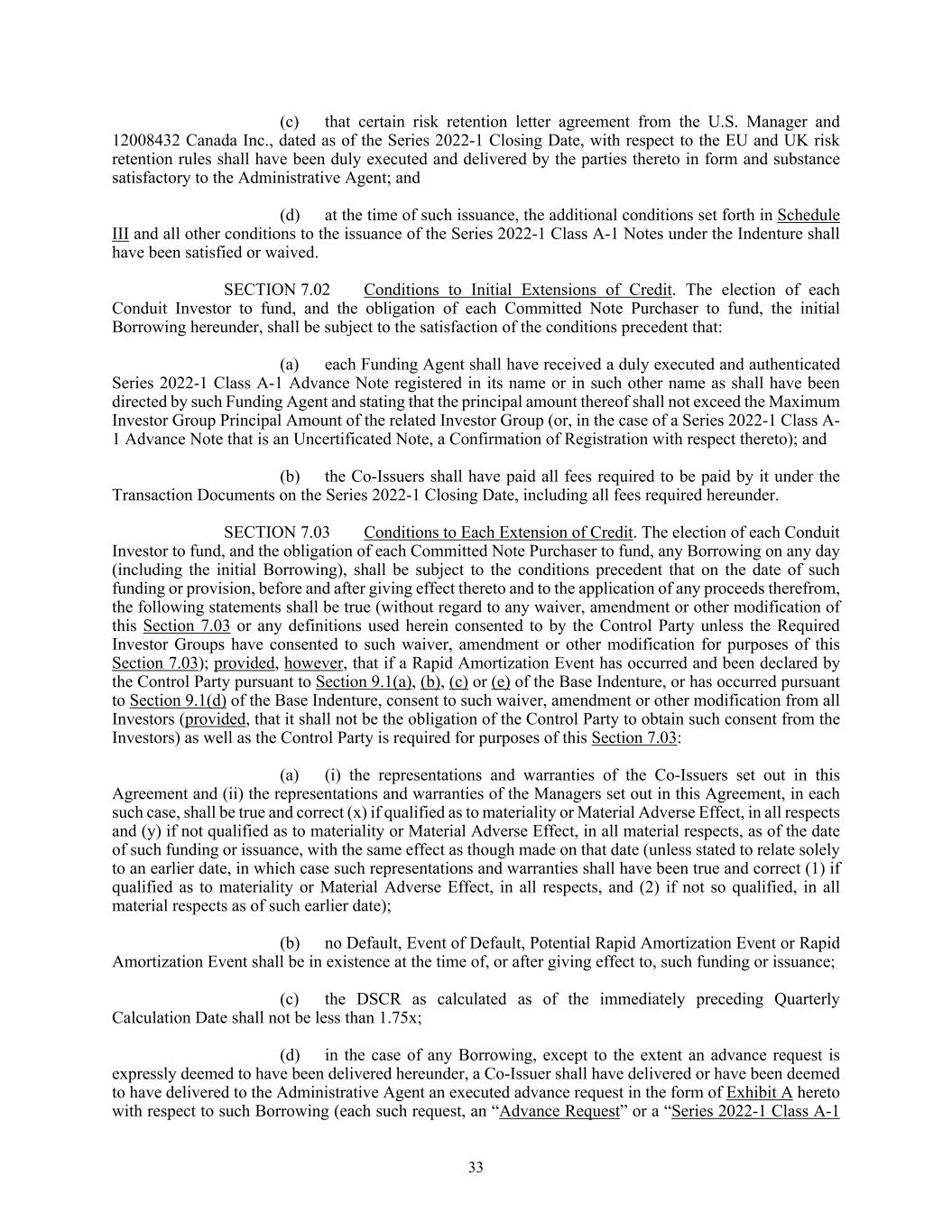 33 (c) that certain risk retention letter agreement from the U.S. Manager and 12008432 Canada Inc., dated as of the Series 2022-1 Closing Date, with respect to the EU and UK risk retention rules shall have been duly executed and delivered by the parties thereto in form and substance satisfactory to the Administrative Agent; and (d) at the time of such issuance, the additional conditions set forth in Schedule III and all other conditions to the issuance of the Series 2022-1 Class A-1 Notes under the Indenture shall have been satisfied or waived. SECTION 7.02 Conditions to Initial Extensions of Credit. The election of each Conduit Investor to fund, and the obligation of each Committed Note Purchaser to fund, the initial Borrowing hereunder, shall be subject to the satisfaction of the conditions precedent that: (a) each Funding Agent shall have received a duly executed and authenticated Series 2022-1 Class A-1 Advance Note registered in its name or in such other name as shall have been directed by such Funding Agent and stating that the principal amount thereof shall not exceed the Maximum Investor Group Principal Amount of the related Investor Group (or, in the case of a Series 2022-1 Class A- 1 Advance Note that is an Uncertificated Note, a Confirmation of Registration with respect thereto); and (b) the Co-Issuers shall have paid all fees required to be paid by it under the Transaction Documents on the Series 2022-1 Closing Date, including all fees required hereunder. SECTION 7.03 Conditions to Each Extension of Credit. The election of each Conduit Investor to fund, and the obligation of each Committed Note Purchaser to fund, any Borrowing on any day (including the initial Borrowing), shall be subject to the conditions precedent that on the date of such funding or provision, before and after giving effect thereto and to the application of any proceeds therefrom, the following statements shall be true (without regard to any waiver, amendment or other modification of this Section 7.03 or any definitions used herein consented to by the Control Party unless the Required Investor Groups have consented to such waiver, amendment or other modification for purposes of this Section 7.03); provided, however, that if a Rapid Amortization Event has occurred and been declared by the Control Party pursuant to Section 9.1(a), (b), (c) or (e) of the Base Indenture, or has occurred pursuant to Section 9.1(d) of the Base Indenture, consent to such waiver, amendment or other modification from all Investors (provided, that it shall not be the obligation of the Control Party to obtain such consent from the Investors) as well as the Control Party is required for purposes of this Section 7.03: (a) (i) the representations and warranties of the Co-Issuers set out in this Agreement and (ii) the representations and warranties of the Managers set out in this Agreement, in each such case, shall be true and correct (x) if qualified as to materiality or Material Adverse Effect, in all respects and (y) if not qualified as to materiality or Material Adverse Effect, in all material respects, as of the date of such funding or issuance, with the same effect as though made on that date (unless stated to relate solely to an earlier date, in which case such representations and warranties shall have been true and correct (1) if qualified as to materiality or Material Adverse Effect, in all respects, and (2) if not so qualified, in all material respects as of such earlier date); (b) no Default, Event of Default, Potential Rapid Amortization Event or Rapid Amortization Event shall be in existence at the time of, or after giving effect to, such funding or issuance; (c) the DSCR as calculated as of the immediately preceding Quarterly Calculation Date shall not be less than 1.75x; (d) in the case of any Borrowing, except to the extent an advance request is expressly deemed to have been delivered hereunder, a Co-Issuer shall have delivered or have been deemed to have delivered to the Administrative Agent an executed advance request in the form of Exhibit A hereto with respect to such Borrowing (each such request, an “Advance Request” or a “Series 2022-1 Class A-1