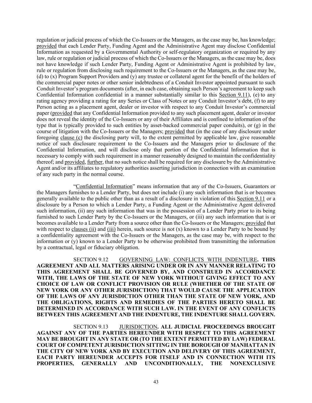 43 regulation or judicial process of which the Co-Issuers or the Managers, as the case may be, has knowledge; provided that each Lender Party, Funding Agent and the Administrative Agent may disclose Confidential Information as requested by a Governmental Authority or self-regulatory organization or required by any law, rule or regulation or judicial process of which the Co-Issuers or the Managers, as the case may be, does not have knowledge if such Lender Party, Funding Agent or Administrative Agent is prohibited by law, rule or regulation from disclosing such requirement to the Co-Issuers or the Managers, as the case may be, (d) to (x) Program Support Providers and (y) any trustee or collateral agent for the benefit of the holders of the commercial paper notes or other senior indebtedness of a Conduit Investor appointed pursuant to such Conduit Investor’s program documents (after, in each case, obtaining such Person’s agreement to keep such Confidential Information confidential in a manner substantially similar to this Section 9.11), (e) to any rating agency providing a rating for any Series or Class of Notes or any Conduit Investor’s debt, (f) to any Person acting as a placement agent, dealer or investor with respect to any Conduit Investor’s commercial paper (provided that any Confidential Information provided to any such placement agent, dealer or investor does not reveal the identity of the Co-Issuers or any of their Affiliates and is confined to information of the type that is typically provided to such entities by asset-backed commercial paper conduits), or (g) in the course of litigation with the Co-Issuers or the Managers; provided that (in the case of any disclosure under foregoing clause (c) the disclosing party will, to the extent permitted by applicable law, give reasonable notice of such disclosure requirement to the Co-Issuers and the Managers prior to disclosure of the Confidential Information, and will disclose only that portion of the Confidential Information that is necessary to comply with such requirement in a manner reasonably designed to maintain the confidentiality thereof; and provided, further, that no such notice shall be required for any disclosure by the Administrative Agent and/or its affiliates to regulatory authorities asserting jurisdiction in connection with an examination of any such party in the normal course. “Confidential Information” means information that any of the Co-Issuers, Guarantors or the Managers furnishes to a Lender Party, but does not include (i) any such information that is or becomes generally available to the public other than as a result of a disclosure in violation of this Section 9.11 or a disclosure by a Person to which a Lender Party, a Funding Agent or the Administrative Agent delivered such information, (ii) any such information that was in the possession of a Lender Party prior to its being furnished to such Lender Party by the Co-Issuers or the Managers, or (iii) any such information that is or becomes available to a Lender Party from a source other than the Co-Issuers or the Managers; provided that with respect to clauses (ii) and (iii) herein, such source is not (x) known to a Lender Party to be bound by a confidentiality agreement with the Co-Issuers or the Managers, as the case may be, with respect to the information or (y) known to a Lender Party to be otherwise prohibited from transmitting the information by a contractual, legal or fiduciary obligation. SECTION 9.12 GOVERNING LAW; CONFLICTS WITH INDENTURE. THIS AGREEMENT AND ALL MATTERS ARISING UNDER OR IN ANY MANNER RELATING TO THIS AGREEMENT SHALL BE GOVERNED BY, AND CONSTRUED IN ACCORDANCE WITH, THE LAWS OF THE STATE OF NEW YORK WITHOUT GIVING EFFECT TO ANY CHOICE OF LAW OR CONFLICT PROVISION OR RULE (WHETHER OF THE STATE OF NEW YORK OR ANY OTHER JURISDICTION) THAT WOULD CAUSE THE APPLICATION OF THE LAWS OF ANY JURISDICTION OTHER THAN THE STATE OF NEW YORK, AND THE OBLIGATIONS, RIGHTS AND REMEDIES OF THE PARTIES HERETO SHALL BE DETERMINED IN ACCORDANCE WITH SUCH LAW. IN THE EVENT OF ANY CONFLICTS BETWEEN THIS AGREEMENT AND THE INDENTURE, THE INDENTURE SHALL GOVERN. SECTION 9.13 JURISDICTION. ALL JUDICIAL PROCEEDINGS BROUGHT AGAINST ANY OF THE PARTIES HEREUNDER WITH RESPECT TO THIS AGREEMENT MAY BE BROUGHT IN ANY STATE OR (TO THE EXTENT PERMITTED BY LAW) FEDERAL COURT OF COMPETENT JURISDICTION SITTING IN THE BOROUGH OF MANHATTAN IN THE CITY OF NEW YORK AND BY EXECUTION AND DELIVERY OF THIS AGREEMENT, EACH PARTY HEREUNDER ACCEPTS FOR ITSELF AND IN CONNECTION WITH ITS PROPERTIES, GENERALLY AND UNCONDITIONALLY, THE NONEXCLUSIVE