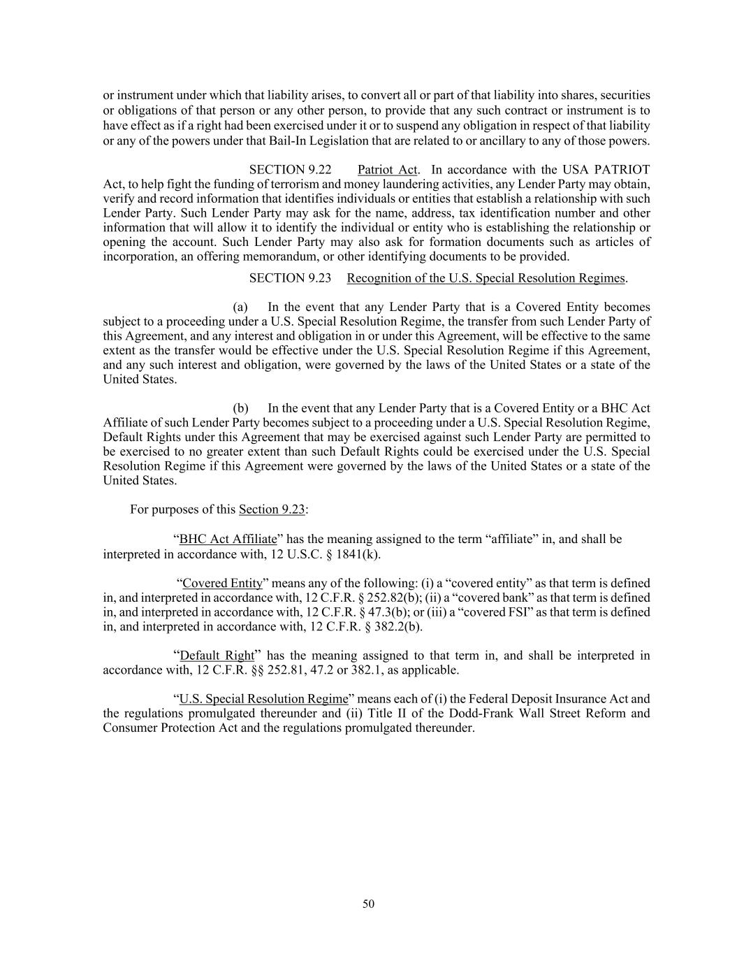50 or instrument under which that liability arises, to convert all or part of that liability into shares, securities or obligations of that person or any other person, to provide that any such contract or instrument is to have effect as if a right had been exercised under it or to suspend any obligation in respect of that liability or any of the powers under that Bail-In Legislation that are related to or ancillary to any of those powers. SECTION 9.22 Patriot Act. In accordance with the USA PATRIOT Act, to help fight the funding of terrorism and money laundering activities, any Lender Party may obtain, verify and record information that identifies individuals or entities that establish a relationship with such Lender Party. Such Lender Party may ask for the name, address, tax identification number and other information that will allow it to identify the individual or entity who is establishing the relationship or opening the account. Such Lender Party may also ask for formation documents such as articles of incorporation, an offering memorandum, or other identifying documents to be provided. SECTION 9.23 Recognition of the U.S. Special Resolution Regimes. (a) In the event that any Lender Party that is a Covered Entity becomes subject to a proceeding under a U.S. Special Resolution Regime, the transfer from such Lender Party of this Agreement, and any interest and obligation in or under this Agreement, will be effective to the same extent as the transfer would be effective under the U.S. Special Resolution Regime if this Agreement, and any such interest and obligation, were governed by the laws of the United States or a state of the United States. (b) In the event that any Lender Party that is a Covered Entity or a BHC Act Affiliate of such Lender Party becomes subject to a proceeding under a U.S. Special Resolution Regime, Default Rights under this Agreement that may be exercised against such Lender Party are permitted to be exercised to no greater extent than such Default Rights could be exercised under the U.S. Special Resolution Regime if this Agreement were governed by the laws of the United States or a state of the United States. For purposes of this Section 9.23: “BHC Act Affiliate” has the meaning assigned to the term “affiliate” in, and shall be interpreted in accordance with, 12 U.S.C. § 1841(k). “Covered Entity” means any of the following: (i) a “covered entity” as that term is defined in, and interpreted in accordance with, 12 C.F.R. § 252.82(b); (ii) a “covered bank” as that term is defined in, and interpreted in accordance with, 12 C.F.R. § 47.3(b); or (iii) a “covered FSI” as that term is defined in, and interpreted in accordance with, 12 C.F.R. § 382.2(b). “Default Right” has the meaning assigned to that term in, and shall be interpreted in accordance with, 12 C.F.R. §§ 252.81, 47.2 or 382.1, as applicable. “U.S. Special Resolution Regime” means each of (i) the Federal Deposit Insurance Act and the regulations promulgated thereunder and (ii) Title II of the Dodd-Frank Wall Street Reform and Consumer Protection Act and the regulations promulgated thereunder.