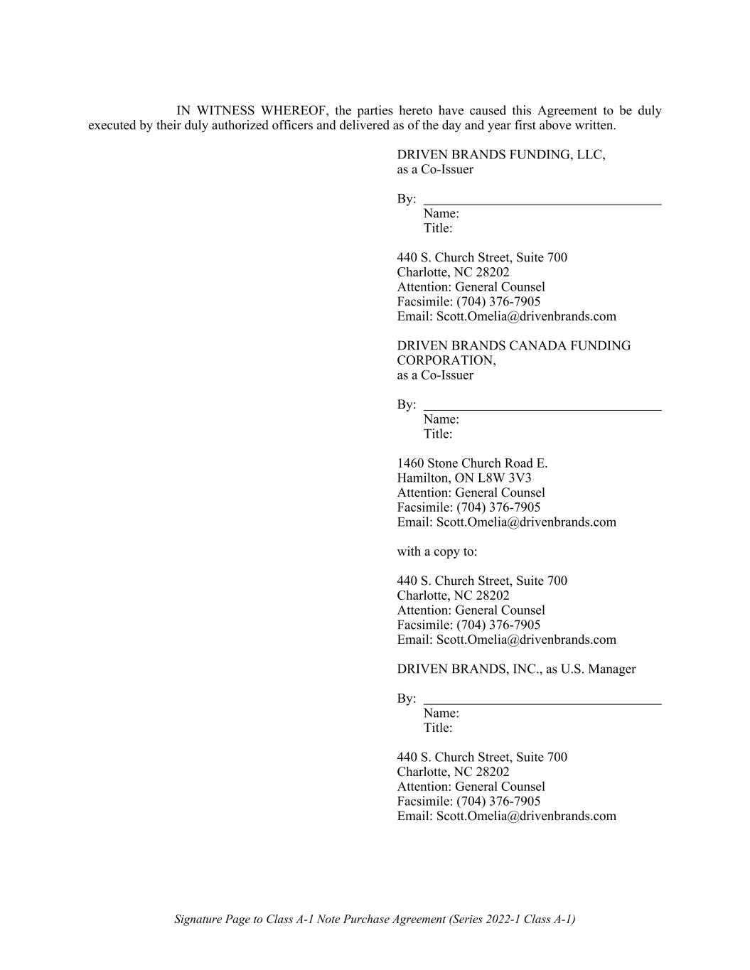 Signature Page to Class A-1 Note Purchase Agreement (Series 2022-1 Class A-1) IN WITNESS WHEREOF, the parties hereto have caused this Agreement to be duly executed by their duly authorized officers and delivered as of the day and year first above written. DRIVEN BRANDS FUNDING, LLC, as a Co-Issuer By: Name: Title: 440 S. Church Street, Suite 700 Charlotte, NC 28202 Attention: General Counsel Facsimile: (704) 376-7905 Email: Scott.Omelia@drivenbrands.com DRIVEN BRANDS CANADA FUNDING CORPORATION, as a Co-Issuer By: Name: Title: 1460 Stone Church Road E. Hamilton, ON L8W 3V3 Attention: General Counsel Facsimile: (704) 376-7905 Email: Scott.Omelia@drivenbrands.com with a copy to: 440 S. Church Street, Suite 700 Charlotte, NC 28202 Attention: General Counsel Facsimile: (704) 376-7905 Email: Scott.Omelia@drivenbrands.com DRIVEN BRANDS, INC., as U.S. Manager By: Name: Title: 440 S. Church Street, Suite 700 Charlotte, NC 28202 Attention: General Counsel Facsimile: (704) 376-7905 Email: Scott.Omelia@drivenbrands.com