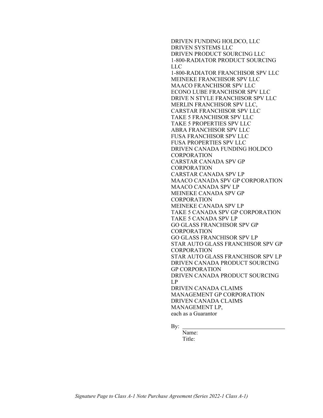 Signature Page to Class A-1 Note Purchase Agreement (Series 2022-1 Class A-1) DRIVEN FUNDING HOLDCO, LLC DRIVEN SYSTEMS LLC DRIVEN PRODUCT SOURCING LLC 1-800-RADIATOR PRODUCT SOURCING LLC 1-800-RADIATOR FRANCHISOR SPV LLC MEINEKE FRANCHISOR SPV LLC MAACO FRANCHISOR SPV LLC ECONO LUBE FRANCHISOR SPV LLC DRIVE N STYLE FRANCHISOR SPV LLC MERLIN FRANCHISOR SPV LLC, CARSTAR FRANCHISOR SPV LLC TAKE 5 FRANCHISOR SPV LLC TAKE 5 PROPERTIES SPV LLC ABRA FRANCHISOR SPV LLC FUSA FRANCHISOR SPV LLC FUSA PROPERTIES SPV LLC DRIVEN CANADA FUNDING HOLDCO CORPORATION CARSTAR CANADA SPV GP CORPORATION CARSTAR CANADA SPV LP MAACO CANADA SPV GP CORPORATION MAACO CANADA SPV LP MEINEKE CANADA SPV GP CORPORATION MEINEKE CANADA SPV LP TAKE 5 CANADA SPV GP CORPORATION TAKE 5 CANADA SPV LP GO GLASS FRANCHISOR SPV GP CORPORATION GO GLASS FRANCHISOR SPV LP STAR AUTO GLASS FRANCHISOR SPV GP CORPORATION STAR AUTO GLASS FRANCHISOR SPV LP DRIVEN CANADA PRODUCT SOURCING GP CORPORATION DRIVEN CANADA PRODUCT SOURCING LP DRIVEN CANADA CLAIMS MANAGEMENT GP CORPORATION DRIVEN CANADA CLAIMS MANAGEMENT LP, each as a Guarantor By: Name: Title: