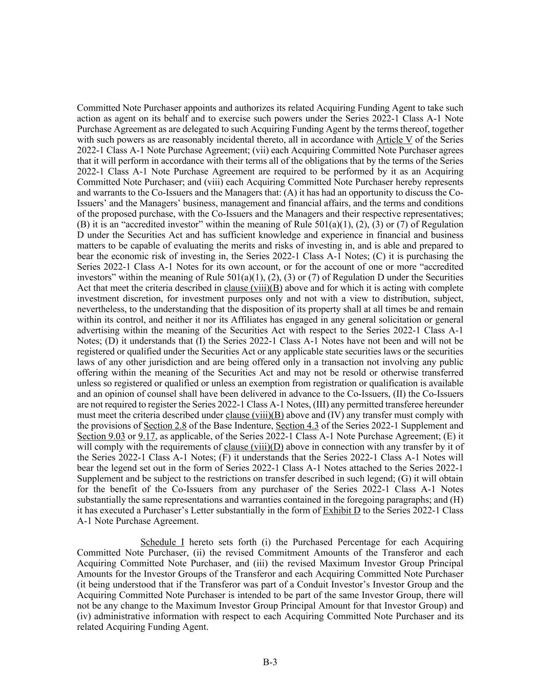 B-3 Committed Note Purchaser appoints and authorizes its related Acquiring Funding Agent to take such action as agent on its behalf and to exercise such powers under the Series 2022-1 Class A-1 Note Purchase Agreement as are delegated to such Acquiring Funding Agent by the terms thereof, together with such powers as are reasonably incidental thereto, all in accordance with Article V of the Series 2022-1 Class A-1 Note Purchase Agreement; (vii) each Acquiring Committed Note Purchaser agrees that it will perform in accordance with their terms all of the obligations that by the terms of the Series 2022-1 Class A-1 Note Purchase Agreement are required to be performed by it as an Acquiring Committed Note Purchaser; and (viii) each Acquiring Committed Note Purchaser hereby represents and warrants to the Co-Issuers and the Managers that: (A) it has had an opportunity to discuss the Co- Issuers’ and the Managers’ business, management and financial affairs, and the terms and conditions of the proposed purchase, with the Co-Issuers and the Managers and their respective representatives; (B) it is an “accredited investor” within the meaning of Rule 501(a)(1), (2), (3) or (7) of Regulation D under the Securities Act and has sufficient knowledge and experience in financial and business matters to be capable of evaluating the merits and risks of investing in, and is able and prepared to bear the economic risk of investing in, the Series 2022-1 Class A-1 Notes; (C) it is purchasing the Series 2022-1 Class A-1 Notes for its own account, or for the account of one or more “accredited investors” within the meaning of Rule 501(a)(1), (2), (3) or (7) of Regulation D under the Securities Act that meet the criteria described in clause (viii)(B) above and for which it is acting with complete investment discretion, for investment purposes only and not with a view to distribution, subject, nevertheless, to the understanding that the disposition of its property shall at all times be and remain within its control, and neither it nor its Affiliates has engaged in any general solicitation or general advertising within the meaning of the Securities Act with respect to the Series 2022-1 Class A-1 Notes; (D) it understands that (I) the Series 2022-1 Class A-1 Notes have not been and will not be registered or qualified under the Securities Act or any applicable state securities laws or the securities laws of any other jurisdiction and are being offered only in a transaction not involving any public offering within the meaning of the Securities Act and may not be resold or otherwise transferred unless so registered or qualified or unless an exemption from registration or qualification is available and an opinion of counsel shall have been delivered in advance to the Co-Issuers, (II) the Co-Issuers are not required to register the Series 2022-1 Class A-1 Notes, (III) any permitted transferee hereunder must meet the criteria described under clause (viii)(B) above and (IV) any transfer must comply with the provisions of Section 2.8 of the Base Indenture, Section 4.3 of the Series 2022-1 Supplement and Section 9.03 or 9.17, as applicable, of the Series 2022-1 Class A-1 Note Purchase Agreement; (E) it will comply with the requirements of clause (viii)(D) above in connection with any transfer by it of the Series 2022-1 Class A-1 Notes; (F) it understands that the Series 2022-1 Class A-1 Notes will bear the legend set out in the form of Series 2022-1 Class A-1 Notes attached to the Series 2022-1 Supplement and be subject to the restrictions on transfer described in such legend; (G) it will obtain for the benefit of the Co-Issuers from any purchaser of the Series 2022-1 Class A-1 Notes substantially the same representations and warranties contained in the foregoing paragraphs; and (H) it has executed a Purchaser’s Letter substantially in the form of Exhibit D to the Series 2022-1 Class A-1 Note Purchase Agreement. Schedule I hereto sets forth (i) the Purchased Percentage for each Acquiring Committed Note Purchaser, (ii) the revised Commitment Amounts of the Transferor and each Acquiring Committed Note Purchaser, and (iii) the revised Maximum Investor Group Principal Amounts for the Investor Groups of the Transferor and each Acquiring Committed Note Purchaser (it being understood that if the Transferor was part of a Conduit Investor’s Investor Group and the Acquiring Committed Note Purchaser is intended to be part of the same Investor Group, there will not be any change to the Maximum Investor Group Principal Amount for that Investor Group) and (iv) administrative information with respect to each Acquiring Committed Note Purchaser and its related Acquiring Funding Agent.
