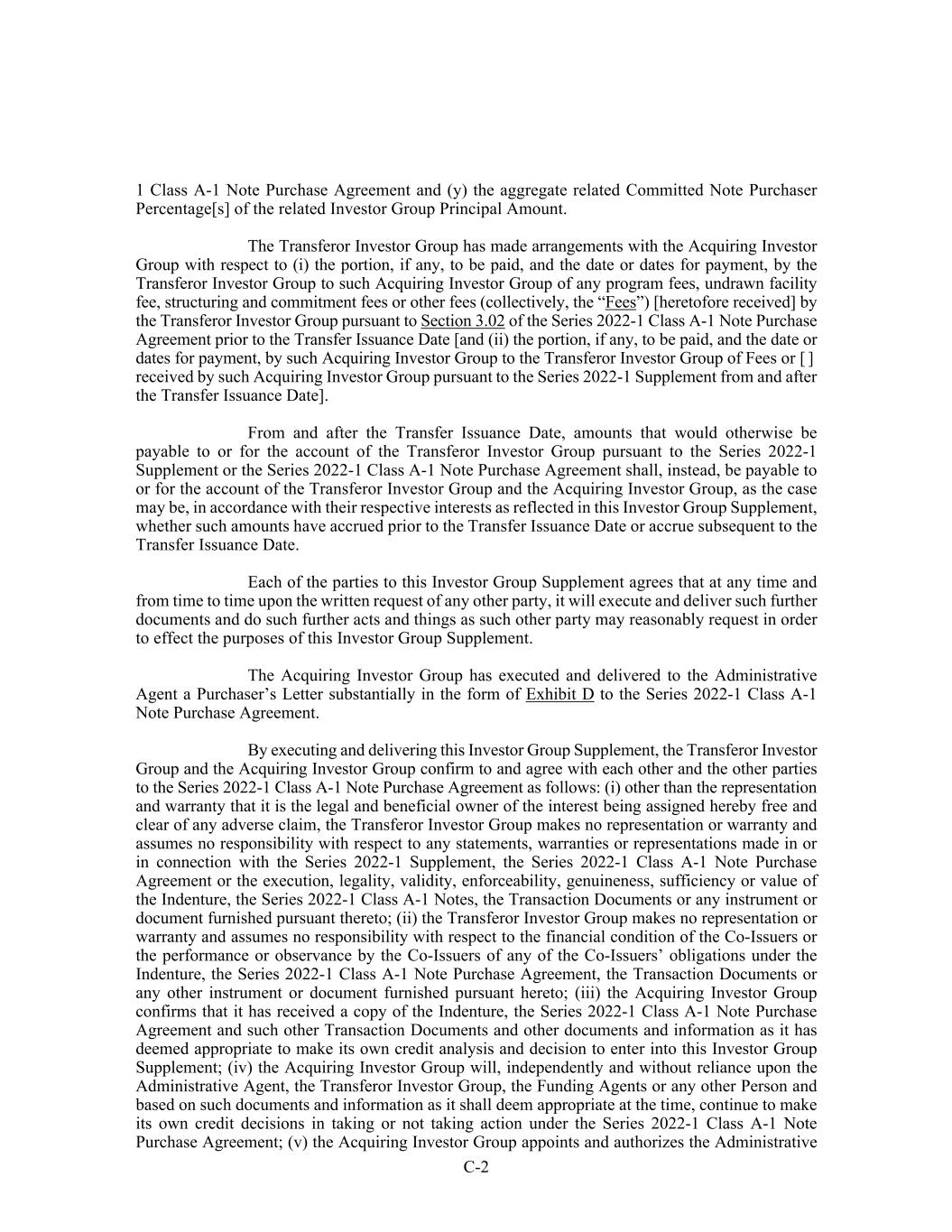 C-2 1 Class A-1 Note Purchase Agreement and (y) the aggregate related Committed Note Purchaser Percentage[s] of the related Investor Group Principal Amount. The Transferor Investor Group has made arrangements with the Acquiring Investor Group with respect to (i) the portion, if any, to be paid, and the date or dates for payment, by the Transferor Investor Group to such Acquiring Investor Group of any program fees, undrawn facility fee, structuring and commitment fees or other fees (collectively, the “Fees”) [heretofore received] by the Transferor Investor Group pursuant to Section 3.02 of the Series 2022-1 Class A-1 Note Purchase Agreement prior to the Transfer Issuance Date [and (ii) the portion, if any, to be paid, and the date or dates for payment, by such Acquiring Investor Group to the Transferor Investor Group of Fees or [ ] received by such Acquiring Investor Group pursuant to the Series 2022-1 Supplement from and after the Transfer Issuance Date]. From and after the Transfer Issuance Date, amounts that would otherwise be payable to or for the account of the Transferor Investor Group pursuant to the Series 2022-1 Supplement or the Series 2022-1 Class A-1 Note Purchase Agreement shall, instead, be payable to or for the account of the Transferor Investor Group and the Acquiring Investor Group, as the case may be, in accordance with their respective interests as reflected in this Investor Group Supplement, whether such amounts have accrued prior to the Transfer Issuance Date or accrue subsequent to the Transfer Issuance Date. Each of the parties to this Investor Group Supplement agrees that at any time and from time to time upon the written request of any other party, it will execute and deliver such further documents and do such further acts and things as such other party may reasonably request in order to effect the purposes of this Investor Group Supplement. The Acquiring Investor Group has executed and delivered to the Administrative Agent a Purchaser’s Letter substantially in the form of Exhibit D to the Series 2022-1 Class A-1 Note Purchase Agreement. By executing and delivering this Investor Group Supplement, the Transferor Investor Group and the Acquiring Investor Group confirm to and agree with each other and the other parties to the Series 2022-1 Class A-1 Note Purchase Agreement as follows: (i) other than the representation and warranty that it is the legal and beneficial owner of the interest being assigned hereby free and clear of any adverse claim, the Transferor Investor Group makes no representation or warranty and assumes no responsibility with respect to any statements, warranties or representations made in or in connection with the Series 2022-1 Supplement, the Series 2022-1 Class A-1 Note Purchase Agreement or the execution, legality, validity, enforceability, genuineness, sufficiency or value of the Indenture, the Series 2022-1 Class A-1 Notes, the Transaction Documents or any instrument or document furnished pursuant thereto; (ii) the Transferor Investor Group makes no representation or warranty and assumes no responsibility with respect to the financial condition of the Co-Issuers or the performance or observance by the Co-Issuers of any of the Co-Issuers’ obligations under the Indenture, the Series 2022-1 Class A-1 Note Purchase Agreement, the Transaction Documents or any other instrument or document furnished pursuant hereto; (iii) the Acquiring Investor Group confirms that it has received a copy of the Indenture, the Series 2022-1 Class A-1 Note Purchase Agreement and such other Transaction Documents and other documents and information as it has deemed appropriate to make its own credit analysis and decision to enter into this Investor Group Supplement; (iv) the Acquiring Investor Group will, independently and without reliance upon the Administrative Agent, the Transferor Investor Group, the Funding Agents or any other Person and based on such documents and information as it shall deem appropriate at the time, continue to make its own credit decisions in taking or not taking action under the Series 2022-1 Class A-1 Note Purchase Agreement; (v) the Acquiring Investor Group appoints and authorizes the Administrative