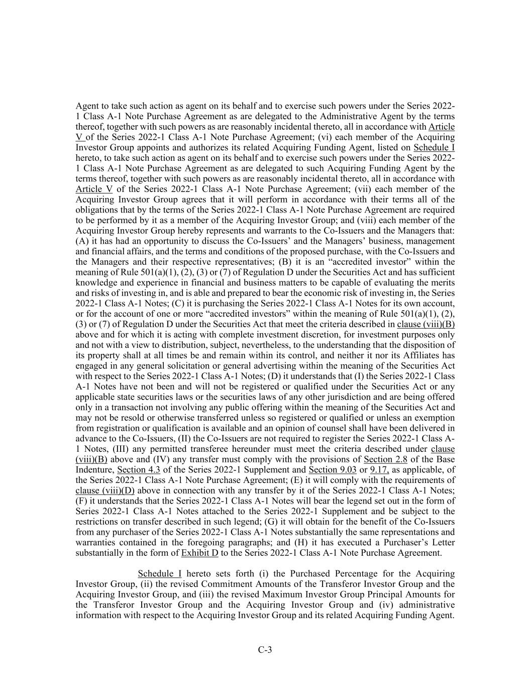 C-3 Agent to take such action as agent on its behalf and to exercise such powers under the Series 2022- 1 Class A-1 Note Purchase Agreement as are delegated to the Administrative Agent by the terms thereof, together with such powers as are reasonably incidental thereto, all in accordance with Article V of the Series 2022-1 Class A-1 Note Purchase Agreement; (vi) each member of the Acquiring Investor Group appoints and authorizes its related Acquiring Funding Agent, listed on Schedule I hereto, to take such action as agent on its behalf and to exercise such powers under the Series 2022- 1 Class A-1 Note Purchase Agreement as are delegated to such Acquiring Funding Agent by the terms thereof, together with such powers as are reasonably incidental thereto, all in accordance with Article V of the Series 2022-1 Class A-1 Note Purchase Agreement; (vii) each member of the Acquiring Investor Group agrees that it will perform in accordance with their terms all of the obligations that by the terms of the Series 2022-1 Class A-1 Note Purchase Agreement are required to be performed by it as a member of the Acquiring Investor Group; and (viii) each member of the Acquiring Investor Group hereby represents and warrants to the Co-Issuers and the Managers that: (A) it has had an opportunity to discuss the Co-Issuers’ and the Managers’ business, management and financial affairs, and the terms and conditions of the proposed purchase, with the Co-Issuers and the Managers and their respective representatives; (B) it is an “accredited investor” within the meaning of Rule 501(a)(1), (2), (3) or (7) of Regulation D under the Securities Act and has sufficient knowledge and experience in financial and business matters to be capable of evaluating the merits and risks of investing in, and is able and prepared to bear the economic risk of investing in, the Series 2022-1 Class A-1 Notes; (C) it is purchasing the Series 2022-1 Class A-1 Notes for its own account, or for the account of one or more “accredited investors” within the meaning of Rule 501(a)(1), (2), (3) or (7) of Regulation D under the Securities Act that meet the criteria described in clause (viii)(B) above and for which it is acting with complete investment discretion, for investment purposes only and not with a view to distribution, subject, nevertheless, to the understanding that the disposition of its property shall at all times be and remain within its control, and neither it nor its Affiliates has engaged in any general solicitation or general advertising within the meaning of the Securities Act with respect to the Series 2022-1 Class A-1 Notes; (D) it understands that (I) the Series 2022-1 Class A-1 Notes have not been and will not be registered or qualified under the Securities Act or any applicable state securities laws or the securities laws of any other jurisdiction and are being offered only in a transaction not involving any public offering within the meaning of the Securities Act and may not be resold or otherwise transferred unless so registered or qualified or unless an exemption from registration or qualification is available and an opinion of counsel shall have been delivered in advance to the Co-Issuers, (II) the Co-Issuers are not required to register the Series 2022-1 Class A- 1 Notes, (III) any permitted transferee hereunder must meet the criteria described under clause (viii)(B) above and (IV) any transfer must comply with the provisions of Section 2.8 of the Base Indenture, Section 4.3 of the Series 2022-1 Supplement and Section 9.03 or 9.17, as applicable, of the Series 2022-1 Class A-1 Note Purchase Agreement; (E) it will comply with the requirements of clause (viii)(D) above in connection with any transfer by it of the Series 2022-1 Class A-1 Notes; (F) it understands that the Series 2022-1 Class A-1 Notes will bear the legend set out in the form of Series 2022-1 Class A-1 Notes attached to the Series 2022-1 Supplement and be subject to the restrictions on transfer described in such legend; (G) it will obtain for the benefit of the Co-Issuers from any purchaser of the Series 2022-1 Class A-1 Notes substantially the same representations and warranties contained in the foregoing paragraphs; and (H) it has executed a Purchaser’s Letter substantially in the form of Exhibit D to the Series 2022-1 Class A-1 Note Purchase Agreement. Schedule I hereto sets forth (i) the Purchased Percentage for the Acquiring Investor Group, (ii) the revised Commitment Amounts of the Transferor Investor Group and the Acquiring Investor Group, and (iii) the revised Maximum Investor Group Principal Amounts for the Transferor Investor Group and the Acquiring Investor Group and (iv) administrative information with respect to the Acquiring Investor Group and its related Acquiring Funding Agent.