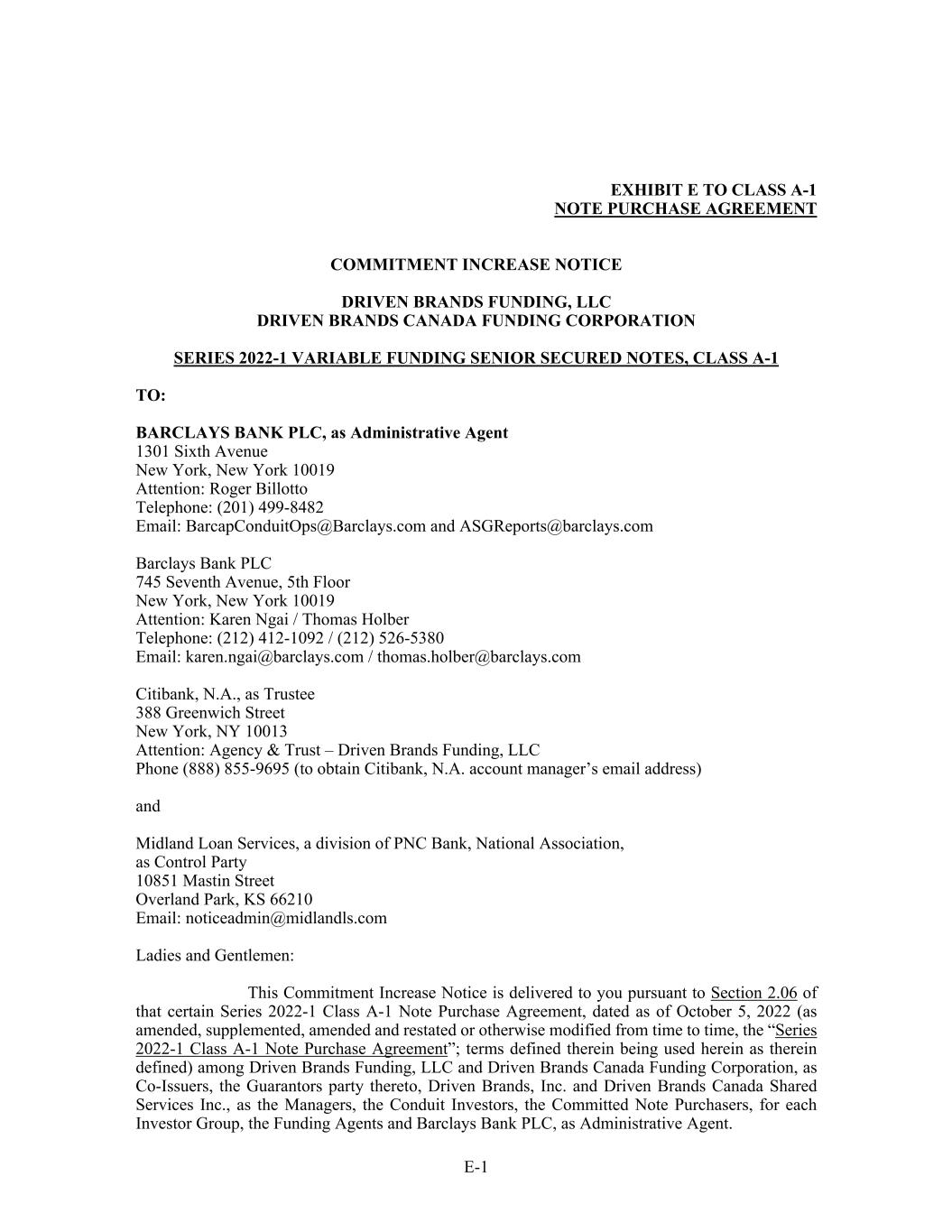 E-1 EXHIBIT E TO CLASS A-1 NOTE PURCHASE AGREEMENT COMMITMENT INCREASE NOTICE DRIVEN BRANDS FUNDING, LLC DRIVEN BRANDS CANADA FUNDING CORPORATION SERIES 2022-1 VARIABLE FUNDING SENIOR SECURED NOTES, CLASS A-1 TO: BARCLAYS BANK PLC, as Administrative Agent 1301 Sixth Avenue New York, New York 10019 Attention: Roger Billotto Telephone: (201) 499-8482 Email: BarcapConduitOps@Barclays.com and ASGReports@barclays.com Barclays Bank PLC 745 Seventh Avenue, 5th Floor New York, New York 10019 Attention: Karen Ngai / Thomas Holber Telephone: (212) 412-1092 / (212) 526-5380 Email: karen.ngai@barclays.com / thomas.holber@barclays.com Citibank, N.A., as Trustee 388 Greenwich Street New York, NY 10013 Attention: Agency & Trust – Driven Brands Funding, LLC Phone (888) 855-9695 (to obtain Citibank, N.A. account manager’s email address) and Midland Loan Services, a division of PNC Bank, National Association, as Control Party 10851 Mastin Street Overland Park, KS 66210 Email: noticeadmin@midlandls.com Ladies and Gentlemen: This Commitment Increase Notice is delivered to you pursuant to Section 2.06 of that certain Series 2022-1 Class A-1 Note Purchase Agreement, dated as of October 5, 2022 (as amended, supplemented, amended and restated or otherwise modified from time to time, the “Series 2022-1 Class A-1 Note Purchase Agreement”; terms defined therein being used herein as therein defined) among Driven Brands Funding, LLC and Driven Brands Canada Funding Corporation, as Co-Issuers, the Guarantors party thereto, Driven Brands, Inc. and Driven Brands Canada Shared Services Inc., as the Managers, the Conduit Investors, the Committed Note Purchasers, for each Investor Group, the Funding Agents and Barclays Bank PLC, as Administrative Agent.