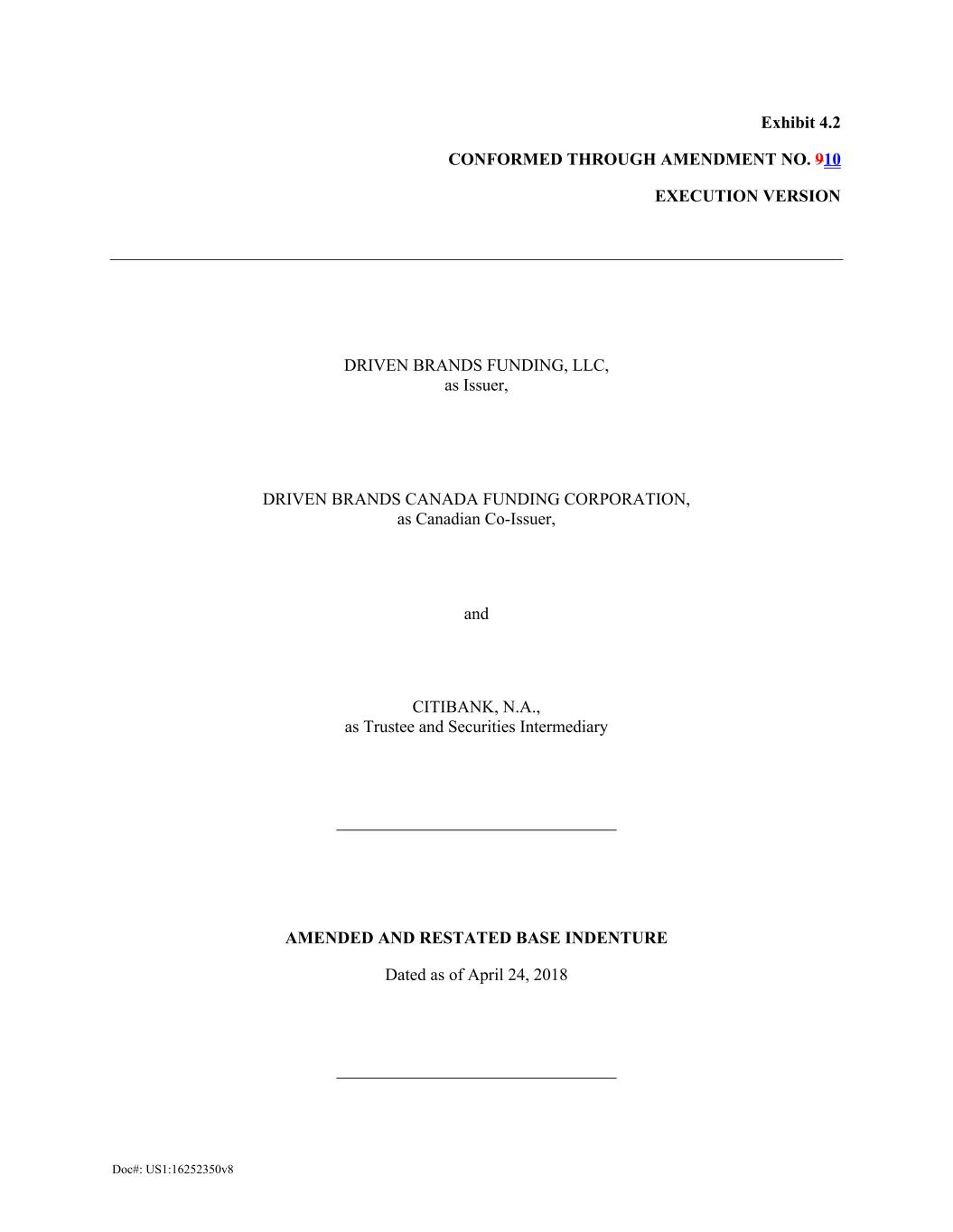 Doc#: US1:16252350v8 Exhibit 4.2 CONFORMED THROUGH AMENDMENT NO. 910 EXECUTION VERSION DRIVEN BRANDS FUNDING, LLC, as Issuer, DRIVEN BRANDS CANADA FUNDING CORPORATION, as Canadian Co-Issuer, and CITIBANK, N.A., as Trustee and Securities Intermediary AMENDED AND RESTATED BASE INDENTURE Dated as of April 24, 2018