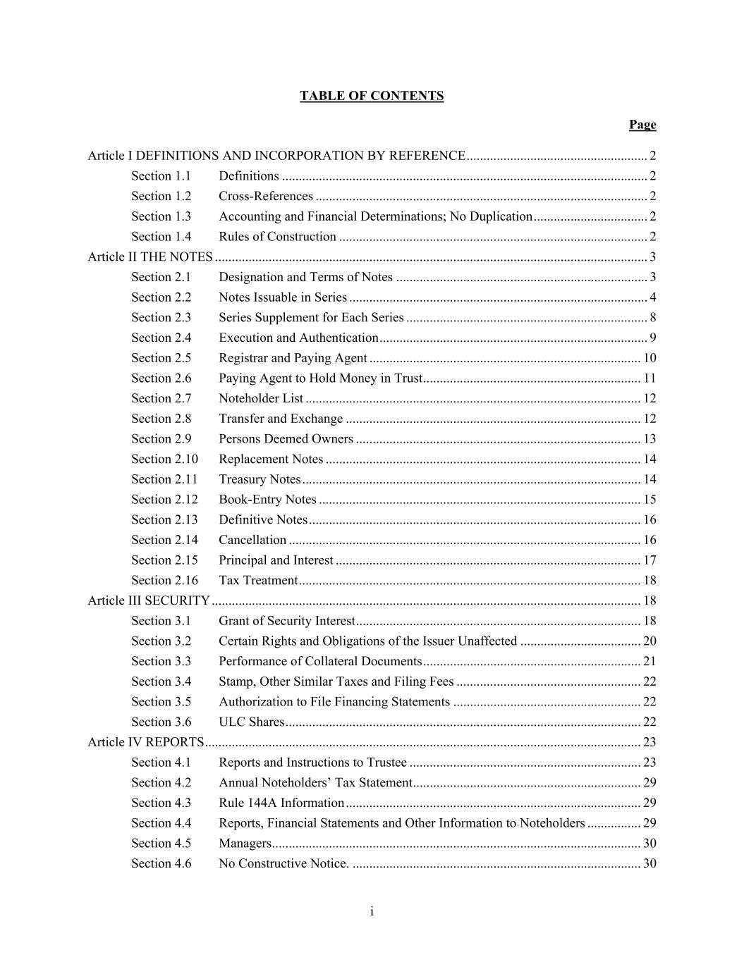 i TABLE OF CONTENTS Page Article I DEFINITIONS AND INCORPORATION BY REFERENCE ...................................................... 2 Section 1.1 Definitions ............................................................................................................. 2 Section 1.2 Cross-References ................................................................................................... 2 Section 1.3 Accounting and Financial Determinations; No Duplication .................................. 2 Section 1.4 Rules of Construction ............................................................................................ 2 Article II THE NOTES ................................................................................................................................. 3 Section 2.1 Designation and Terms of Notes ........................................................................... 3 Section 2.2 Notes Issuable in Series ......................................................................................... 4 Section 2.3 Series Supplement for Each Series ........................................................................ 8 Section 2.4 Execution and Authentication ................................................................................ 9 Section 2.5 Registrar and Paying Agent ................................................................................. 10 Section 2.6 Paying Agent to Hold Money in Trust ................................................................. 11 Section 2.7 Noteholder List .................................................................................................... 12 Section 2.8 Transfer and Exchange ........................................................................................ 12 Section 2.9 Persons Deemed Owners ..................................................................................... 13 Section 2.10 Replacement Notes .............................................................................................. 14 Section 2.11 Treasury Notes ..................................................................................................... 14 Section 2.12 Book-Entry Notes ................................................................................................ 15 Section 2.13 Definitive Notes ................................................................................................... 16 Section 2.14 Cancellation ......................................................................................................... 16 Section 2.15 Principal and Interest ........................................................................................... 17 Section 2.16 Tax Treatment ...................................................................................................... 18 Article III SECURITY ................................................................................................................................ 18 Section 3.1 Grant of Security Interest ..................................................................................... 18 Section 3.2 Certain Rights and Obligations of the Issuer Unaffected .................................... 20 Section 3.3 Performance of Collateral Documents ................................................................. 21 Section 3.4 Stamp, Other Similar Taxes and Filing Fees ....................................................... 22 Section 3.5 Authorization to File Financing Statements ........................................................ 22 Section 3.6 ULC Shares .......................................................................................................... 22 Article IV REPORTS .................................................................................................................................. 23 Section 4.1 Reports and Instructions to Trustee ..................................................................... 23 Section 4.2 Annual Noteholders’ Tax Statement .................................................................... 29 Section 4.3 Rule 144A Information ........................................................................................ 29 Section 4.4 Reports, Financial Statements and Other Information to Noteholders ................ 29 Section 4.5 Managers .............................................................................................................. 30 Section 4.6 No Constructive Notice. ...................................................................................... 30