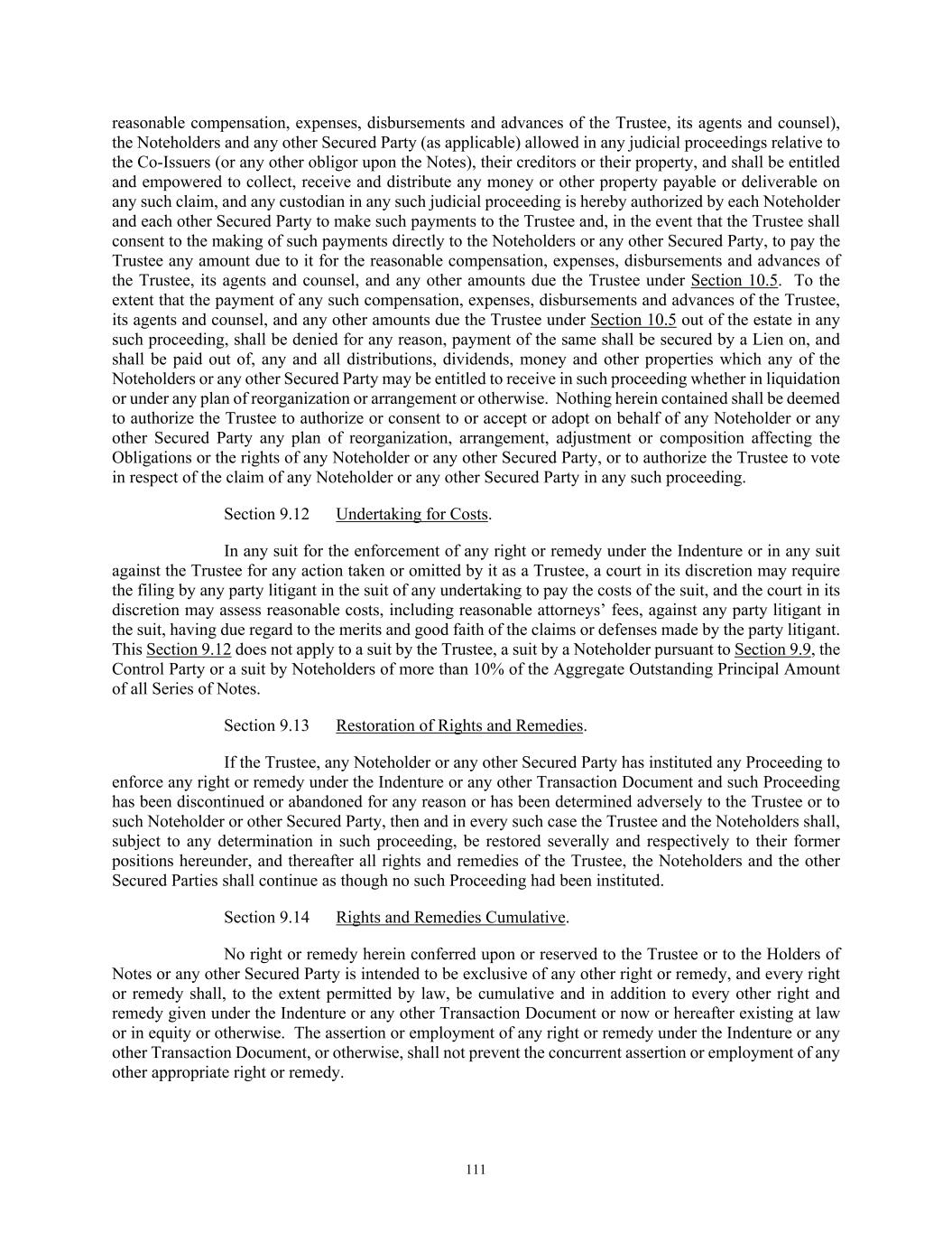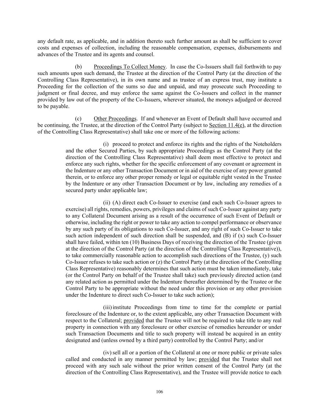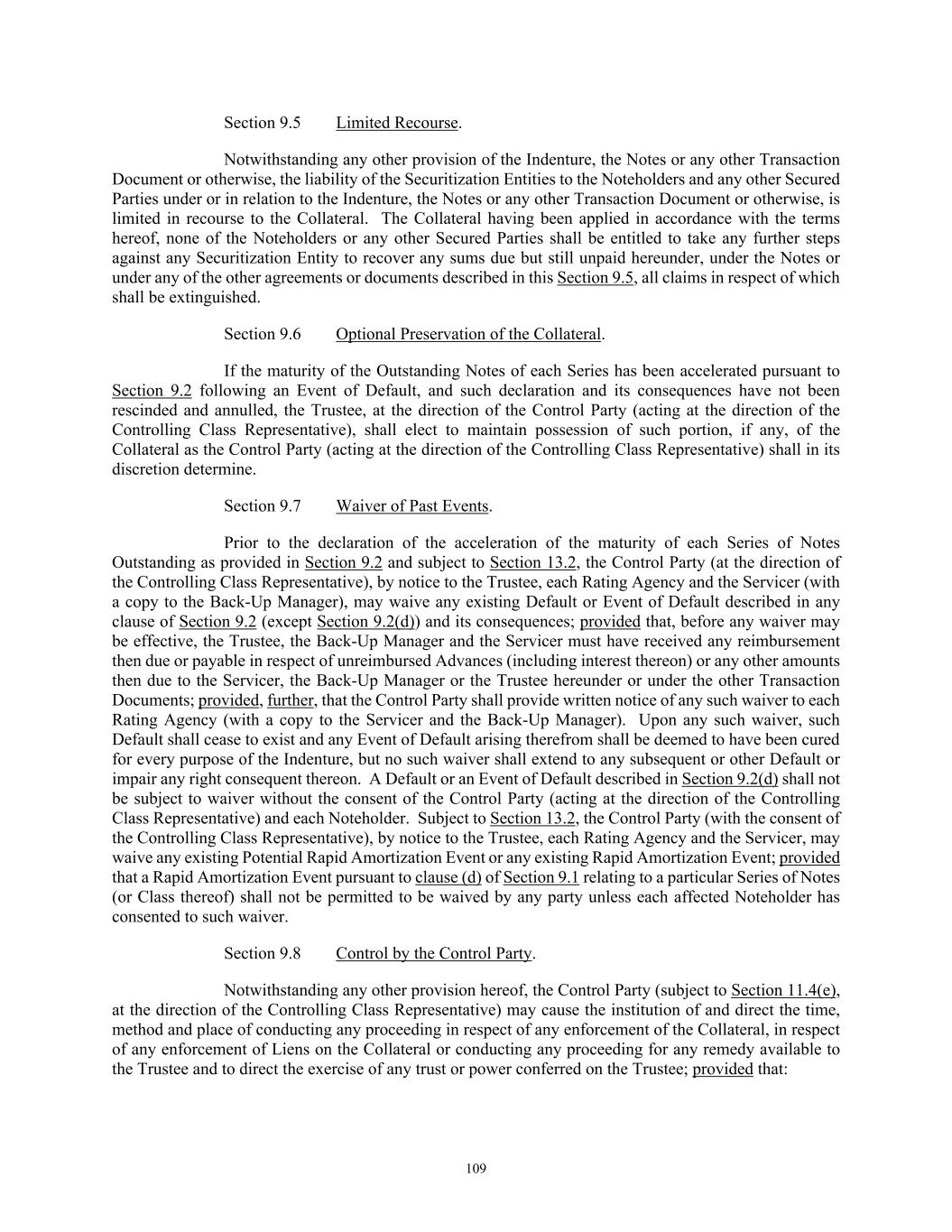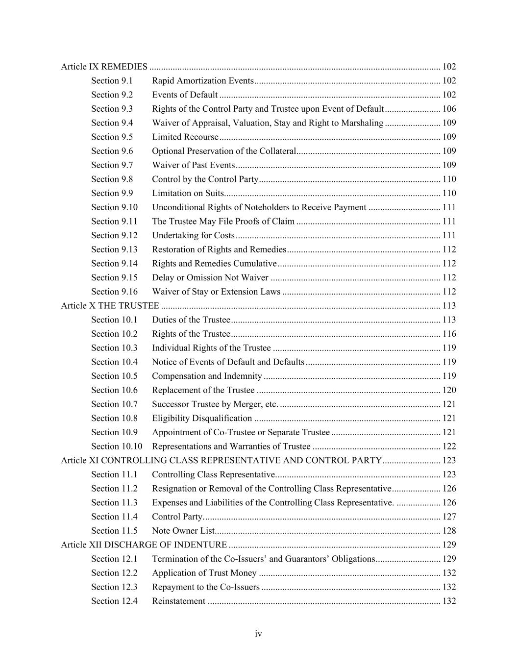 iv Article IX REMEDIES ............................................................................................................................. 102 Section 9.1 Rapid Amortization Events ................................................................................ 102 Section 9.2 Events of Default ............................................................................................... 102 Section 9.3 Rights of the Control Party and Trustee upon Event of Default ........................ 106 Section 9.4 Waiver of Appraisal, Valuation, Stay and Right to Marshaling ........................ 109 Section 9.5 Limited Recourse ............................................................................................... 109 Section 9.6 Optional Preservation of the Collateral .............................................................. 109 Section 9.7 Waiver of Past Events ........................................................................................ 109 Section 9.8 Control by the Control Party .............................................................................. 110 Section 9.9 Limitation on Suits............................................................................................. 110 Section 9.10 Unconditional Rights of Noteholders to Receive Payment ............................... 111 Section 9.11 The Trustee May File Proofs of Claim .............................................................. 111 Section 9.12 Undertaking for Costs ........................................................................................ 111 Section 9.13 Restoration of Rights and Remedies .................................................................. 112 Section 9.14 Rights and Remedies Cumulative ...................................................................... 112 Section 9.15 Delay or Omission Not Waiver ......................................................................... 112 Section 9.16 Waiver of Stay or Extension Laws .................................................................... 112 Article X THE TRUSTEE ........................................................................................................................ 113 Section 10.1 Duties of the Trustee .......................................................................................... 113 Section 10.2 Rights of the Trustee .......................................................................................... 116 Section 10.3 Individual Rights of the Trustee ........................................................................ 119 Section 10.4 Notice of Events of Default and Defaults .......................................................... 119 Section 10.5 Compensation and Indemnity ............................................................................ 119 Section 10.6 Replacement of the Trustee ............................................................................... 120 Section 10.7 Successor Trustee by Merger, etc. ..................................................................... 121 Section 10.8 Eligibility Disqualification ................................................................................ 121 Section 10.9 Appointment of Co-Trustee or Separate Trustee ............................................... 121 Section 10.10 Representations and Warranties of Trustee ....................................................... 122 Article XI CONTROLLING CLASS REPRESENTATIVE AND CONTROL PARTY ......................... 123 Section 11.1 Controlling Class Representative. ...................................................................... 123 Section 11.2 Resignation or Removal of the Controlling Class Representative ..................... 126 Section 11.3 Expenses and Liabilities of the Controlling Class Representative. ................... 126 Section 11.4 Control Party. ..................................................................................................... 127 Section 11.5 Note Owner List................................................................................................. 128 Article XII DISCHARGE OF INDENTURE ........................................................................................... 129 Section 12.1 Termination of the Co-Issuers’ and Guarantors’ Obligations ............................ 129 Section 12.2 Application of Trust Money .............................................................................. 132 Section 12.3 Repayment to the Co-Issuers ............................................................................. 132 Section 12.4 Reinstatement .................................................................................................... 132