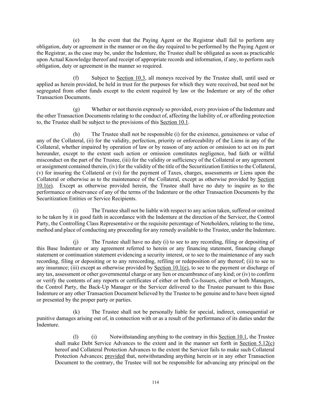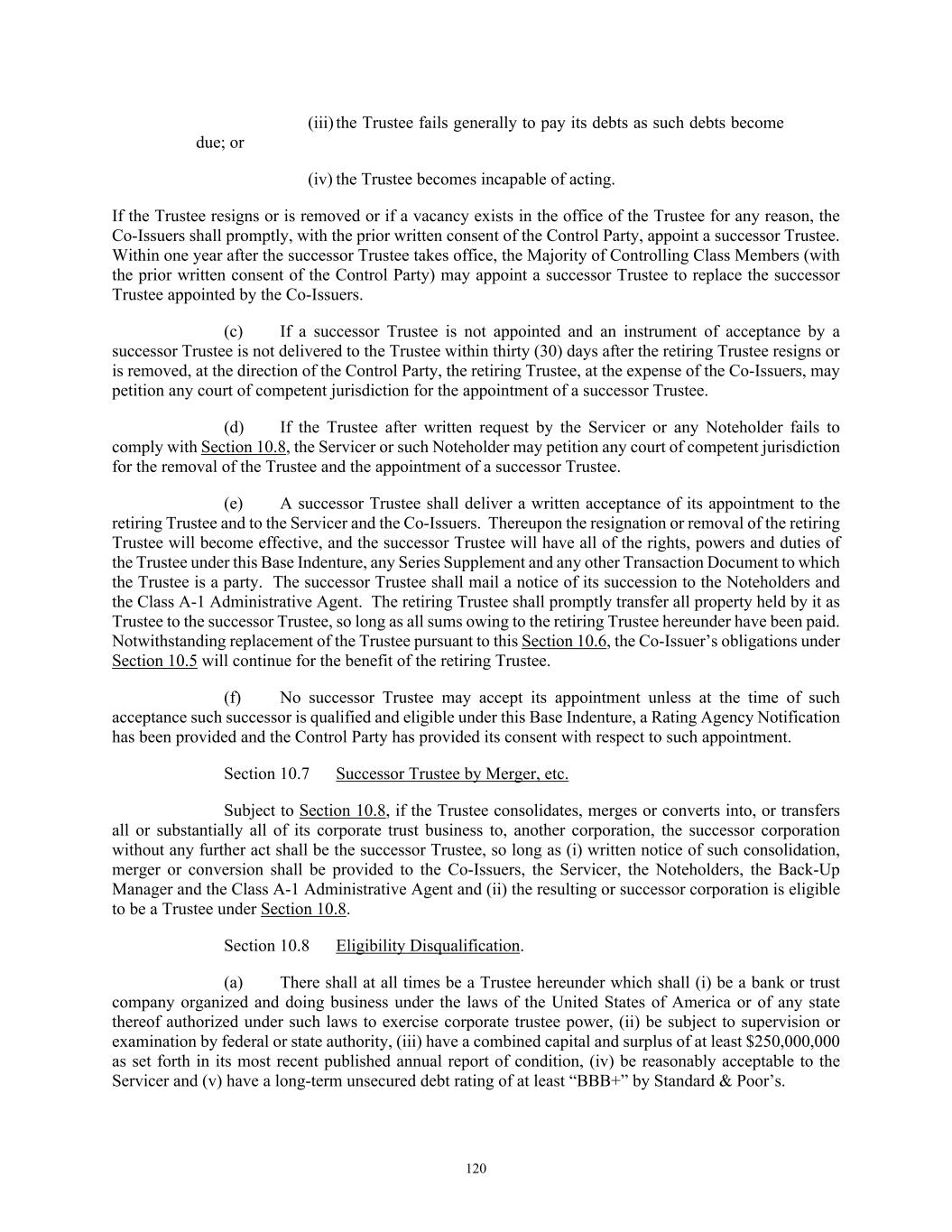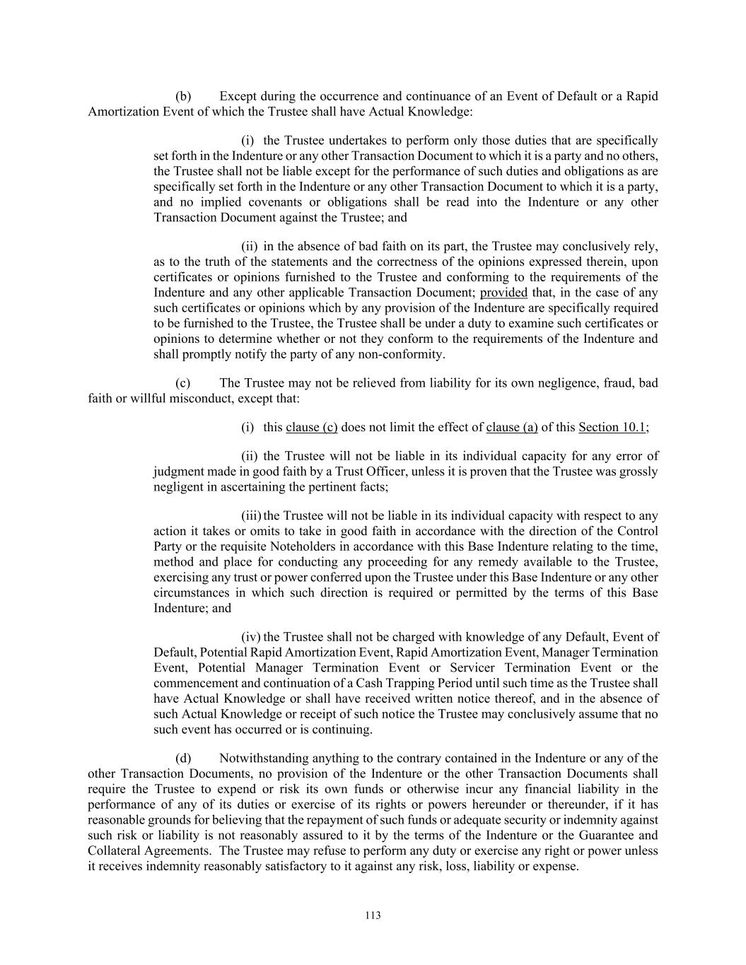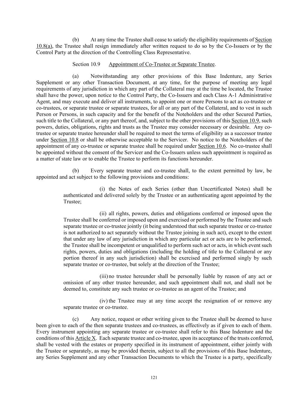 iv Article IX REMEDIES ............................................................................................................................. 102 Section 9.1 Rapid Amortization Events ................................................................................ 102 Section 9.2 Events of Default ............................................................................................... 102 Section 9.3 Rights of the Control Party and Trustee upon Event of Default ........................ 106 Section 9.4 Waiver of Appraisal, Valuation, Stay and Right to Marshaling ........................ 109 Section 9.5 Limited Recourse ............................................................................................... 109 Section 9.6 Optional Preservation of the Collateral .............................................................. 109 Section 9.7 Waiver of Past Events ........................................................................................ 109 Section 9.8 Control by the Control Party .............................................................................. 110 Section 9.9 Limitation on Suits............................................................................................. 110 Section 9.10 Unconditional Rights of Noteholders to Receive Payment ............................... 111 Section 9.11 The Trustee May File Proofs of Claim .............................................................. 111 Section 9.12 Undertaking for Costs ........................................................................................ 111 Section 9.13 Restoration of Rights and Remedies .................................................................. 112 Section 9.14 Rights and Remedies Cumulative ...................................................................... 112 Section 9.15 Delay or Omission Not Waiver ......................................................................... 112 Section 9.16 Waiver of Stay or Extension Laws .................................................................... 112 Article X THE TRUSTEE ........................................................................................................................ 113 Section 10.1 Duties of the Trustee .......................................................................................... 113 Section 10.2 Rights of the Trustee .......................................................................................... 116 Section 10.3 Individual Rights of the Trustee ........................................................................ 119 Section 10.4 Notice of Events of Default and Defaults .......................................................... 119 Section 10.5 Compensation and Indemnity ............................................................................ 119 Section 10.6 Replacement of the Trustee ............................................................................... 120 Section 10.7 Successor Trustee by Merger, etc. ..................................................................... 121 Section 10.8 Eligibility Disqualification ................................................................................ 121 Section 10.9 Appointment of Co-Trustee or Separate Trustee ............................................... 121 Section 10.10 Representations and Warranties of Trustee ....................................................... 122 Article XI CONTROLLING CLASS REPRESENTATIVE AND CONTROL PARTY ......................... 123 Section 11.1 Controlling Class Representative. ...................................................................... 123 Section 11.2 Resignation or Removal of the Controlling Class Representative ..................... 126 Section 11.3 Expenses and Liabilities of the Controlling Class Representative. ................... 126 Section 11.4 Control Party. ..................................................................................................... 127 Section 11.5 Note Owner List................................................................................................. 128 Article XII DISCHARGE OF INDENTURE ........................................................................................... 129 Section 12.1 Termination of the Co-Issuers’ and Guarantors’ Obligations ............................ 129 Section 12.2 Application of Trust Money .............................................................................. 132 Section 12.3 Repayment to the Co-Issuers ............................................................................. 132 Section 12.4 Reinstatement .................................................................................................... 132