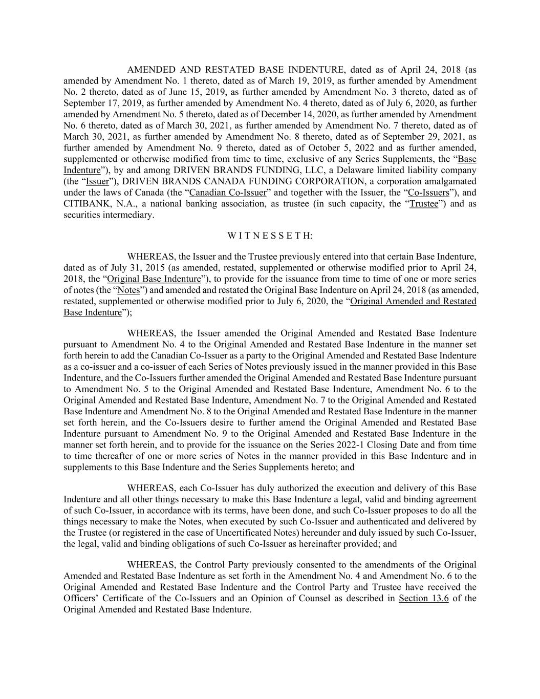 AMENDED AND RESTATED BASE INDENTURE, dated as of April 24, 2018 (as amended by Amendment No. 1 thereto, dated as of March 19, 2019, as further amended by Amendment No. 2 thereto, dated as of June 15, 2019, as further amended by Amendment No. 3 thereto, dated as of September 17, 2019, as further amended by Amendment No. 4 thereto, dated as of July 6, 2020, as further amended by Amendment No. 5 thereto, dated as of December 14, 2020, as further amended by Amendment No. 6 thereto, dated as of March 30, 2021, as further amended by Amendment No. 7 thereto, dated as of March 30, 2021, as further amended by Amendment No. 8 thereto, dated as of September 29, 2021, as further amended by Amendment No. 9 thereto, dated as of October 5, 2022 and as further amended, supplemented or otherwise modified from time to time, exclusive of any Series Supplements, the “Base Indenture”), by and among DRIVEN BRANDS FUNDING, LLC, a Delaware limited liability company (the “Issuer”), DRIVEN BRANDS CANADA FUNDING CORPORATION, a corporation amalgamated under the laws of Canada (the “Canadian Co-Issuer” and together with the Issuer, the “Co-Issuers”), and CITIBANK, N.A., a national banking association, as trustee (in such capacity, the “Trustee”) and as securities intermediary. W I T N E S S E T H: WHEREAS, the Issuer and the Trustee previously entered into that certain Base Indenture, dated as of July 31, 2015 (as amended, restated, supplemented or otherwise modified prior to April 24, 2018, the “Original Base Indenture”), to provide for the issuance from time to time of one or more series of notes (the “Notes”) and amended and restated the Original Base Indenture on April 24, 2018 (as amended, restated, supplemented or otherwise modified prior to July 6, 2020, the “Original Amended and Restated Base Indenture”); WHEREAS, the Issuer amended the Original Amended and Restated Base Indenture pursuant to Amendment No. 4 to the Original Amended and Restated Base Indenture in the manner set forth herein to add the Canadian Co-Issuer as a party to the Original Amended and Restated Base Indenture as a co-issuer and a co-issuer of each Series of Notes previously issued in the manner provided in this Base Indenture, and the Co-Issuers further amended the Original Amended and Restated Base Indenture pursuant to Amendment No. 5 to the Original Amended and Restated Base Indenture, Amendment No. 6 to the Original Amended and Restated Base Indenture, Amendment No. 7 to the Original Amended and Restated Base Indenture and Amendment No. 8 to the Original Amended and Restated Base Indenture in the manner set forth herein, and the Co-Issuers desire to further amend the Original Amended and Restated Base Indenture pursuant to Amendment No. 9 to the Original Amended and Restated Base Indenture in the manner set forth herein, and to provide for the issuance on the Series 2022-1 Closing Date and from time to time thereafter of one or more series of Notes in the manner provided in this Base Indenture and in supplements to this Base Indenture and the Series Supplements hereto; and WHEREAS, each Co-Issuer has duly authorized the execution and delivery of this Base Indenture and all other things necessary to make this Base Indenture a legal, valid and binding agreement of such Co-Issuer, in accordance with its terms, have been done, and such Co-Issuer proposes to do all the things necessary to make the Notes, when executed by such Co-Issuer and authenticated and delivered by the Trustee (or registered in the case of Uncertificated Notes) hereunder and duly issued by such Co-Issuer, the legal, valid and binding obligations of such Co-Issuer as hereinafter provided; and WHEREAS, the Control Party previously consented to the amendments of the Original Amended and Restated Base Indenture as set forth in the Amendment No. 4 and Amendment No. 6 to the Original Amended and Restated Base Indenture and the Control Party and Trustee have received the Officers’ Certificate of the Co-Issuers and an Opinion of Counsel as described in Section 13.6 of the Original Amended and Restated Base Indenture.